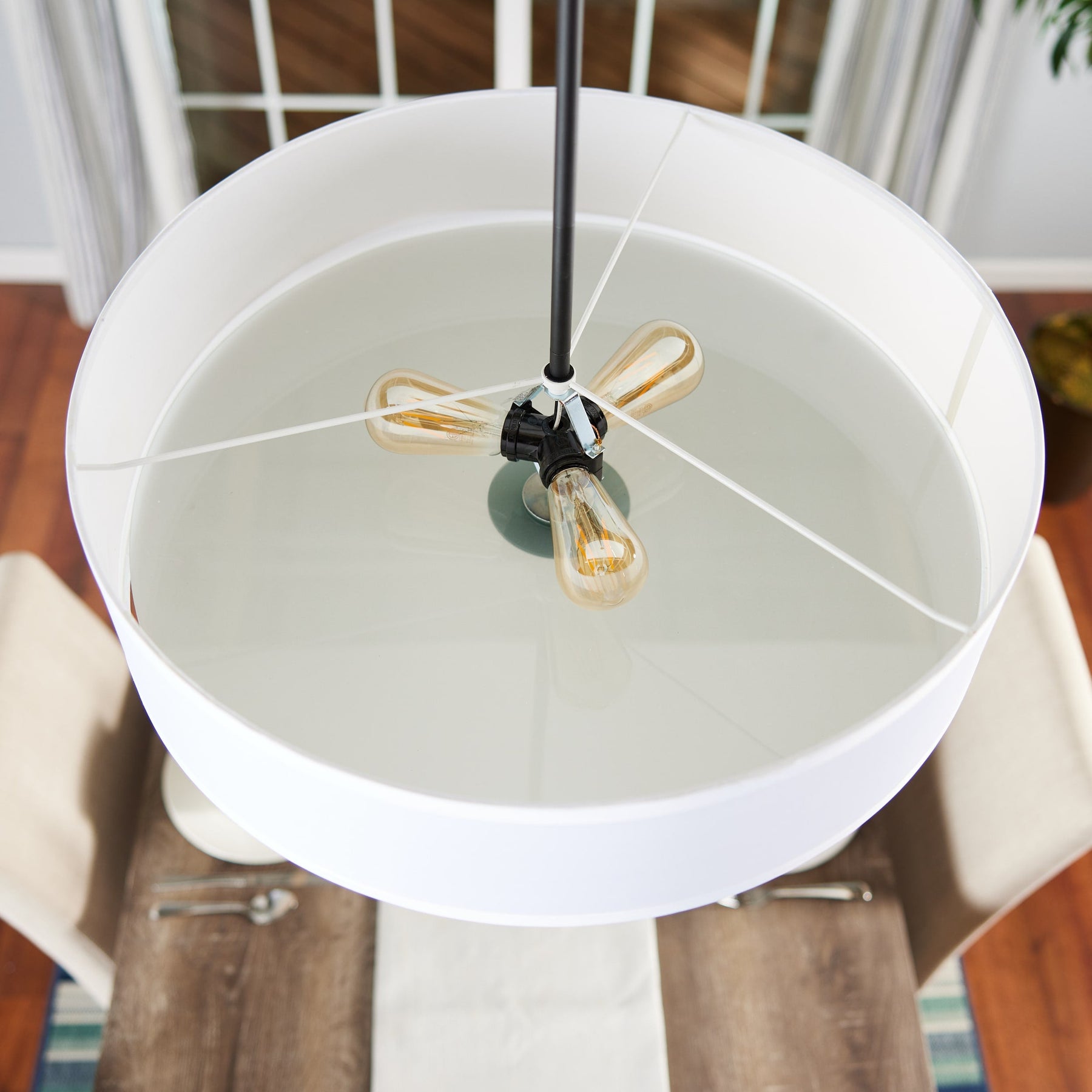 Transform your living space with the Kichler Drum 3-Light Pendant Light, an embodiment of refined elegance. Its chic black finish paired with a luscious white microfiber shade effortlessly elevates any room, from a modern dining area to a sophisticated foyer. Highlighting its minimalist drum shape, this fixture serves as both an art piece and a practical lighting solution. Position it above a sleek kitchen island or over a stylish dining table to create a stunning impact, making it an essential fixture for luxurious and timeless home styling.