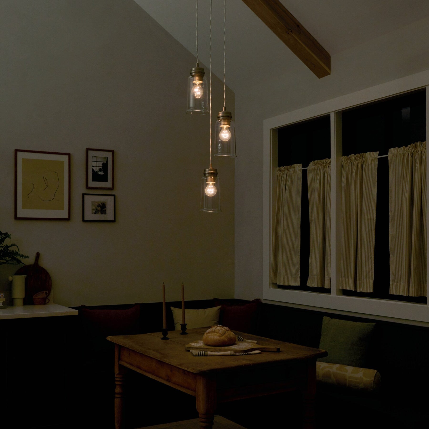Introducing the Jaylen Pendant Light—a fusion of rustic charm and contemporary sophistication, capturing light's essence in its purest form. The clear glass cylinders showcase a warm luminosity, brilliantly framed by an elegant brushed nickel structure. As a statement piece over your dining table or kitchen island, it exudes an inviting glow that shapes the ambiance. Undeniably, this pendant light is a beacon of refined elegance, essential for any luxurious home setting.
