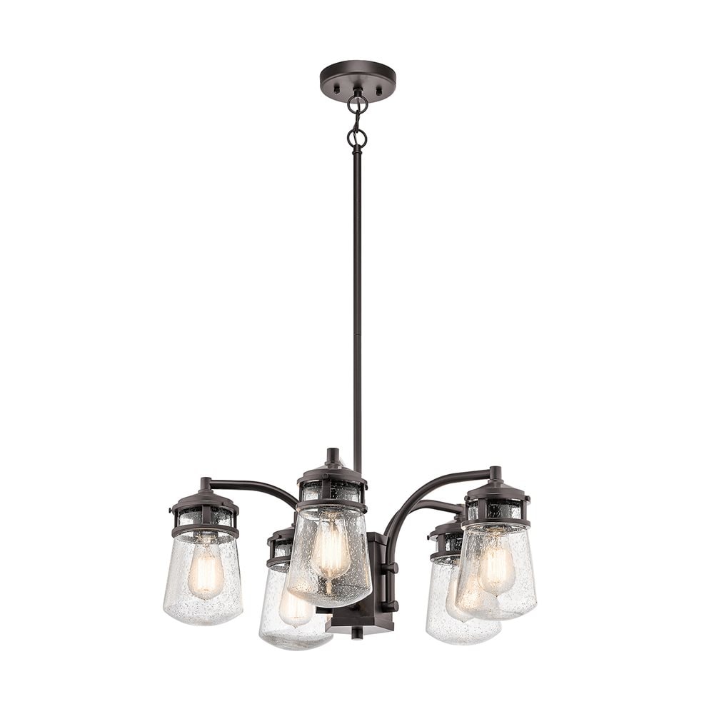 Transform your outdoor space with the Kichler Lyndon 5-Light Outdoor Pendant. Featuring an elegant architectural bronze finish and clear seedy glass jar shades, it harmoniously blends traditional elements with a streamlined design, ensuring a sophisticated update to any exterior decor.