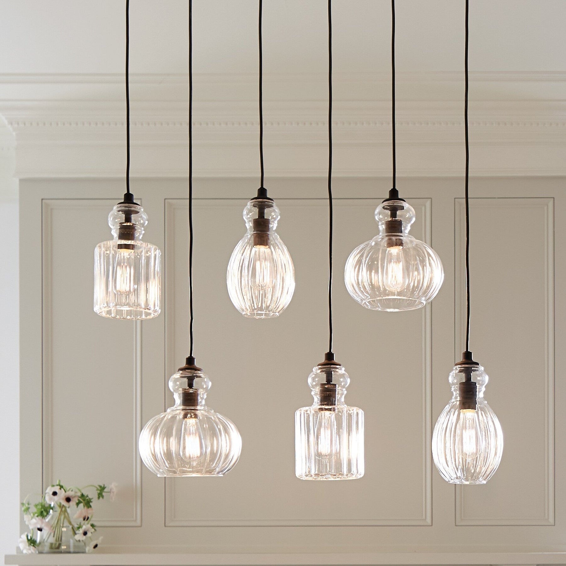 - Decorative Design: Features six ribbed glass shades and an antique Olde Bronze finish, reminiscent of vintage perfume bottles.