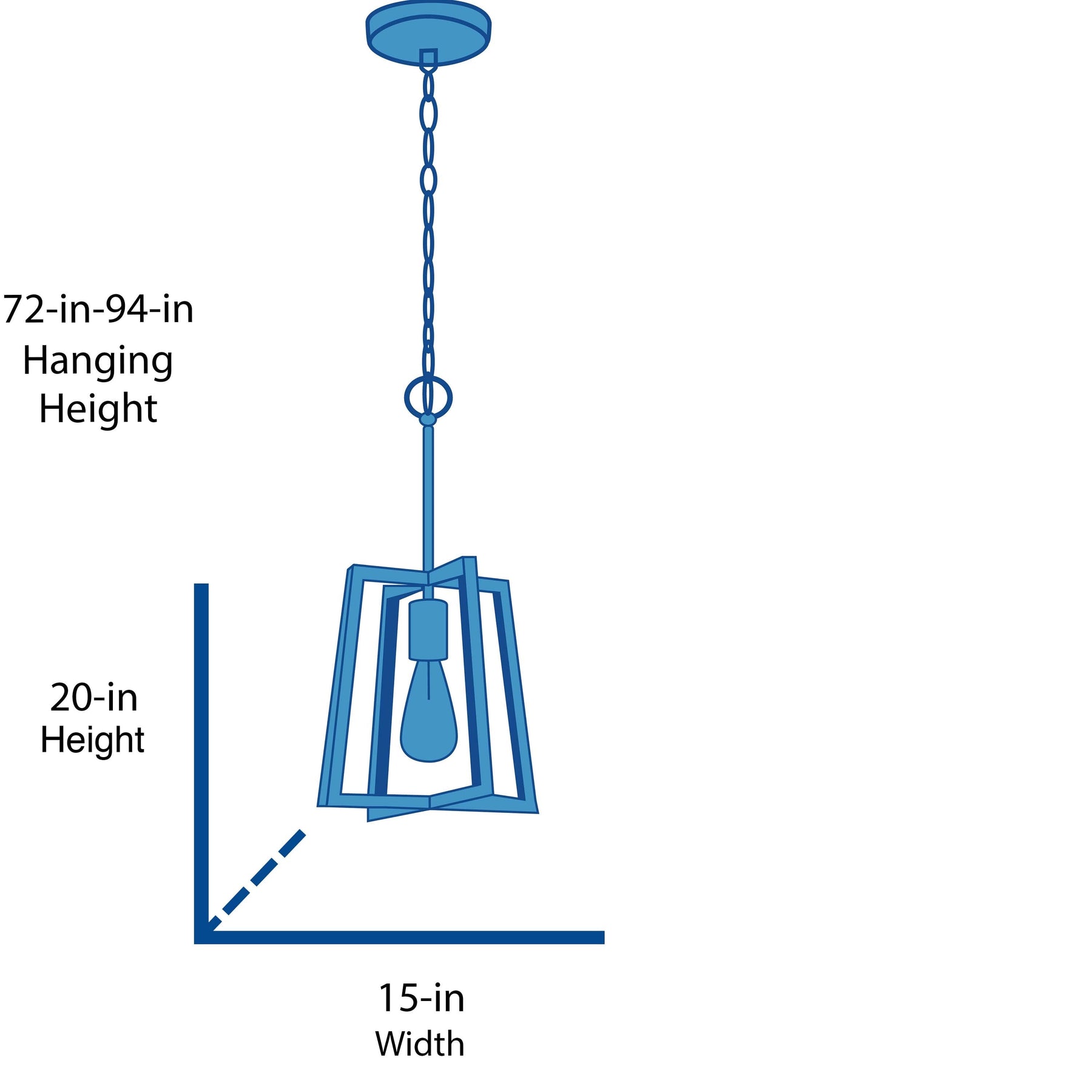 A: The fixture measures 15 inches in diameter and 20 inches in height, with an adjustable chain that allows for a maximum hanging height of 94 inches.