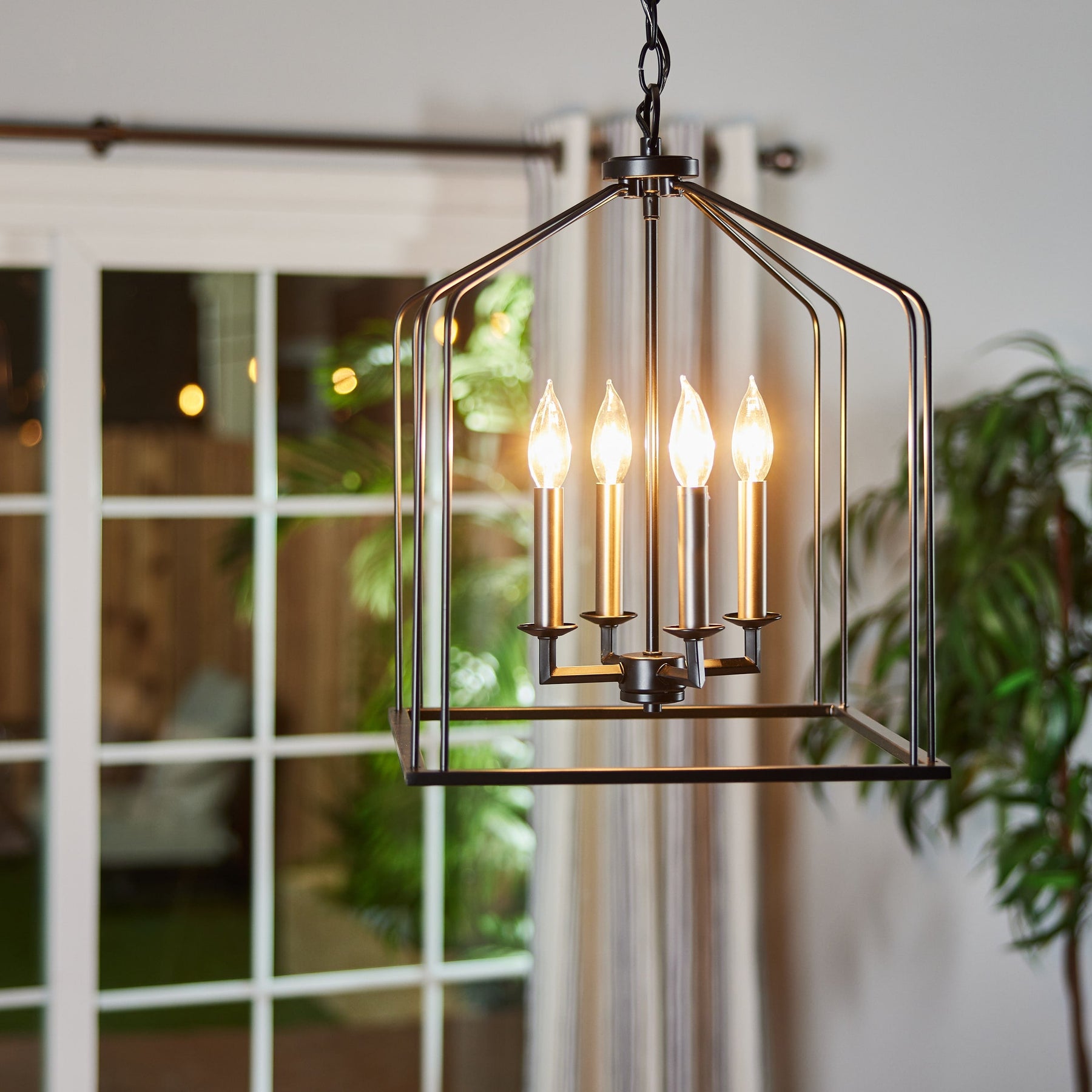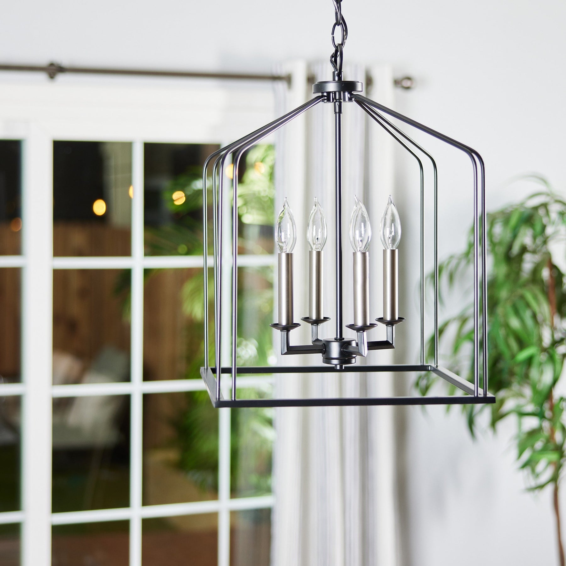 • Design: Open cage lantern with black and antique nickel finishes for a farmhouse aesthetic