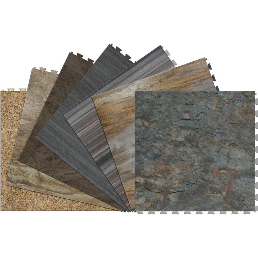 Sample of Perfection Floor Tile’s StoneCreek Collection interlocking vinyl tile in Matta Matta/Satin. Features a 20‑mil wear layer with a satin, speckled stone look for durable, easy‑to‑maintain floors in residential or commercial spaces.