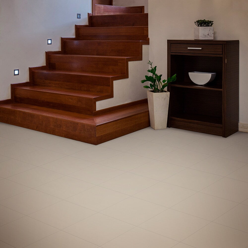 This tile whispers luxury with a refined leather-like grain that instantly warms any room. The satin finish catches light softly, creating a tailored foundation beneath sculptural furniture and clean architectural lines. Try a checkerboard mix of Buck and a lighter neutral for a couture, custom look. It’s a chic essential that elevates daily living with practicality and polish.
