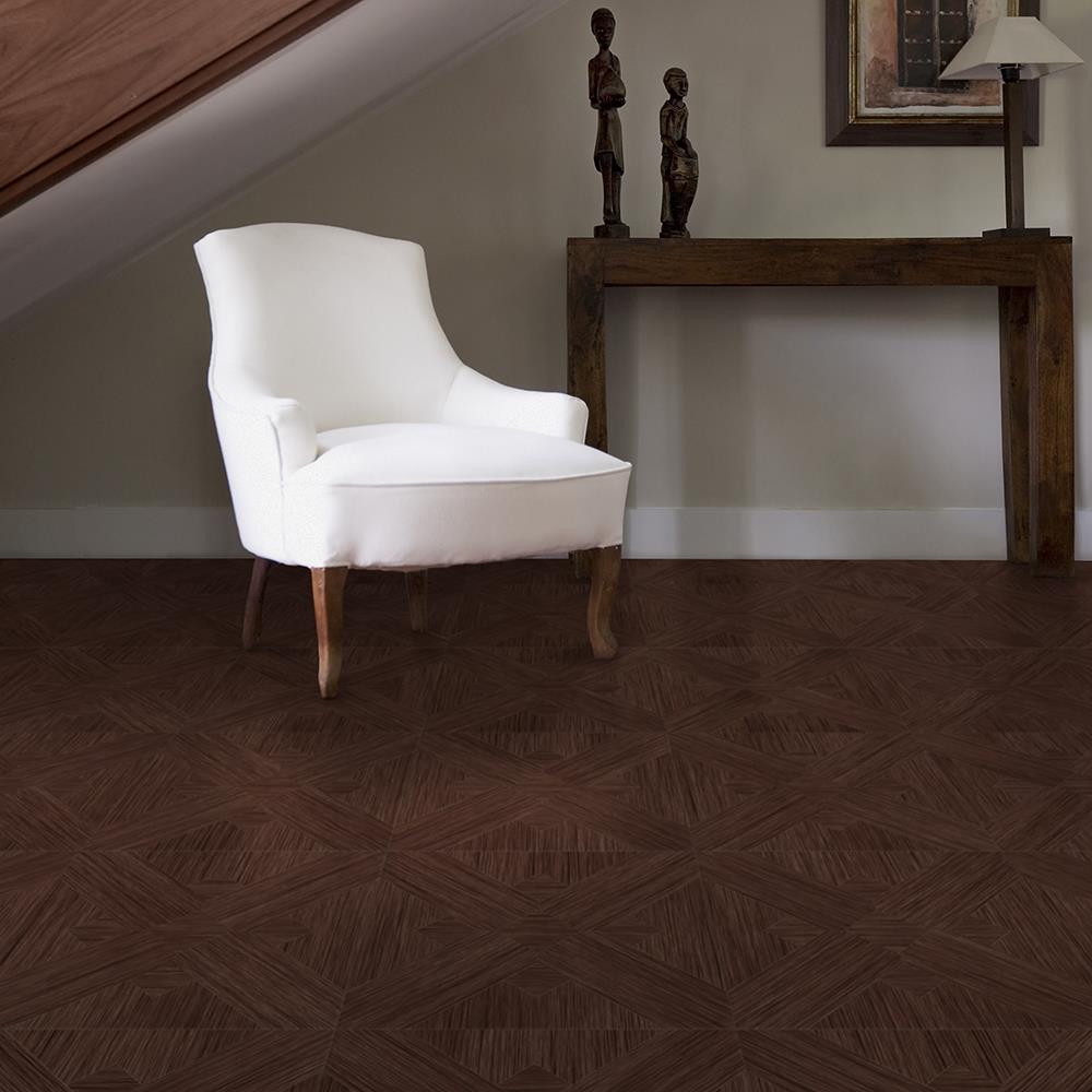 This tile captures the romance of traditional parquet in a deep Bordeaux Walnut tone, instantly grounding a room with refined warmth. The satin finish softens light beautifully, while the crisp geometric inlay adds tailored architecture underfoot. Layer it with neutral upholstery and aged brass accents to let the pattern sing. A chic essential for spaces that crave both durability and quiet luxury.