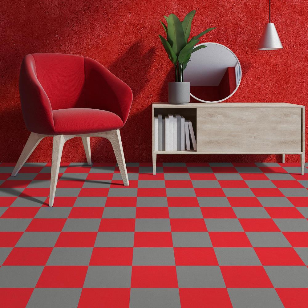 Retro-inspired luxury vinyl tiles with hidden interlocking tabs create a classic checkerboard look in silver and red. Water-resistant, easy to install, and durable for residential or commercial spaces.