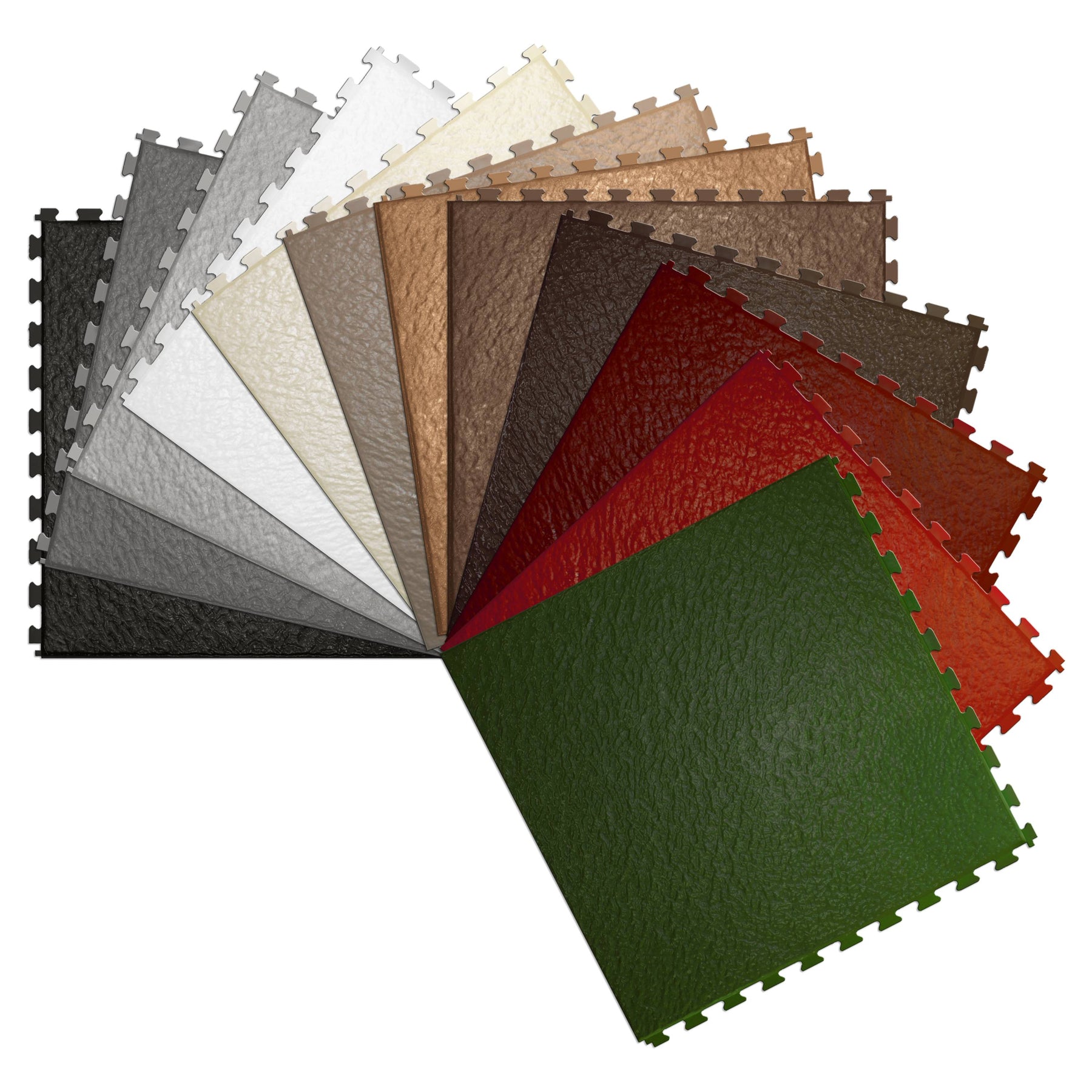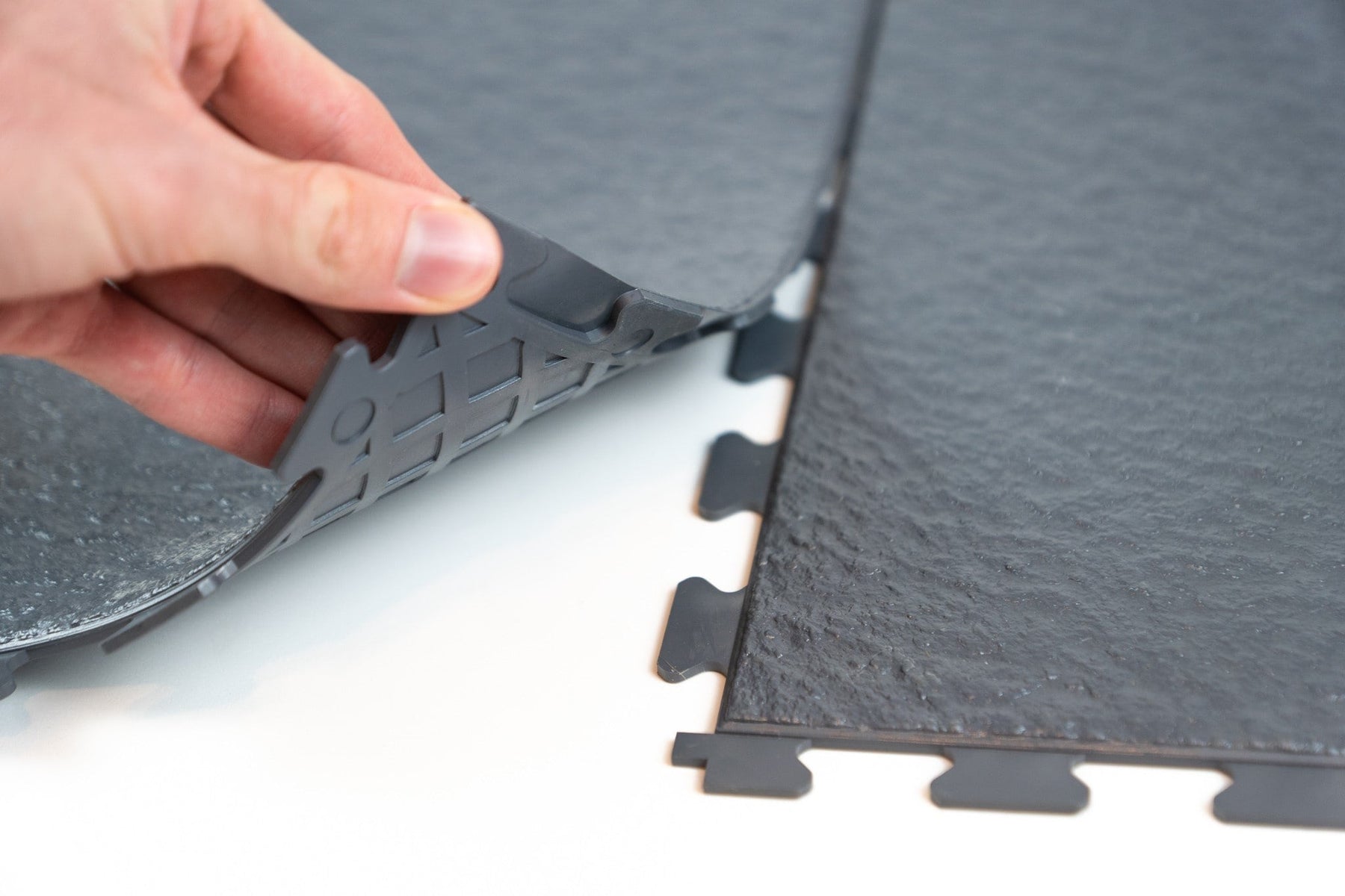 Upgrade your space with Perfection Floor Tile's Homestyle Slate Collection. These 20-inch by 20-inch interlocking vinyl/plastic gym floor tiles feature an easy-fit tab system, making installation a breeze. Durable, sound absorbent, and resistant to stains, they are perfect for high-traffic areas like exercise rooms and playrooms.