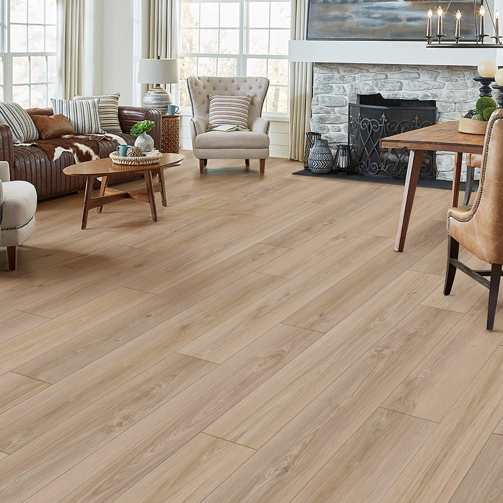 Pergo DuraCraft's Newbridge Hickory Vinyl Plank Flooring invites warmth and sophistication into any room. Its extra-long planks and wirebrushed texture create a luxurious, spacious feel. Pair it with soft, neutral furnishings to echo its natural tones, or contrast with deep woods for a striking effect. This flooring exudes a sense of timeless style, ensuring that your space remains both chic and functional.