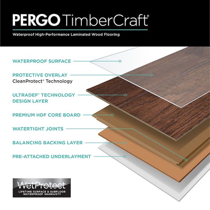 Elevate your space with Pergo TimberCraft +WetProtect Dixon Oak Laminate Flooring. This 12-mm thick, waterproof, and durable flooring ensures lifetime protection against stains and scratches while featuring the authentic look of weathered oak. Ideal for high-moisture areas, it's as easy to install as it is to maintain.