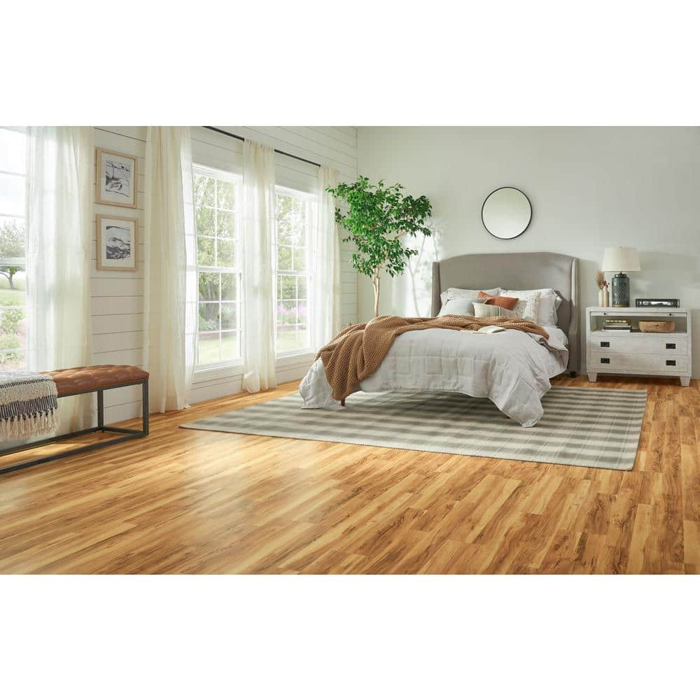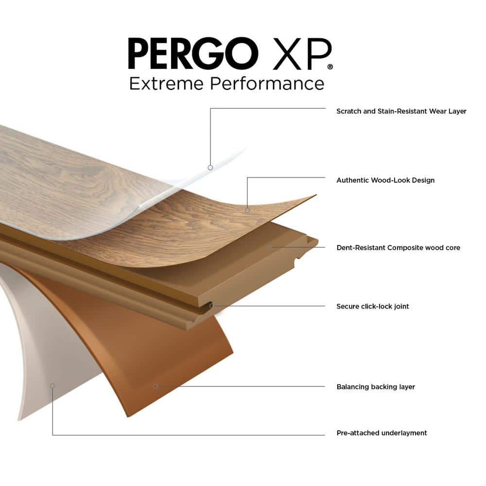 Transform your space with Pergo XP Ellwood Maple laminate flooring, known for its water-resistant and durable nature. This flooring combines a beautiful caramel and cream spalted maple design with a fortified surface to resist dents, scratches, and stains, ensuring your floors stay pristine. Easy to install with a click-lock mechanism and built-in underlayment for noise reduction, it's perfect for any room in your home.
