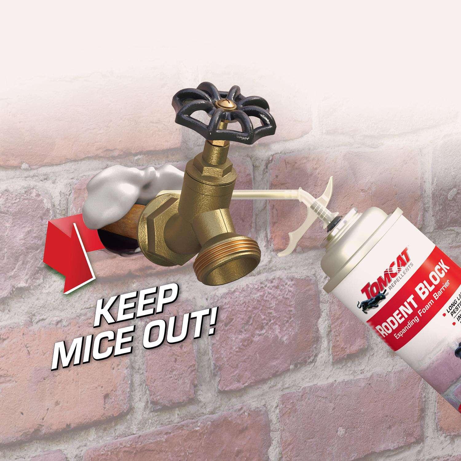Tomcat Rodent Block Expanding Foam Barrier fills gaps and cracks to keep mice from coming inside your home. This expanding foam is specially formulated to block mice, providing a long-lasting, airtight and water-resistant bond to most building materials. The foam can be trimmed, sanded, and painted if desired. Use in crevices inside and outside your home, including the garage, attic, basement, and foundation. Tomcat Rodent Block Expanding Foam Barrier is the pesticide-free way to keep mice out.