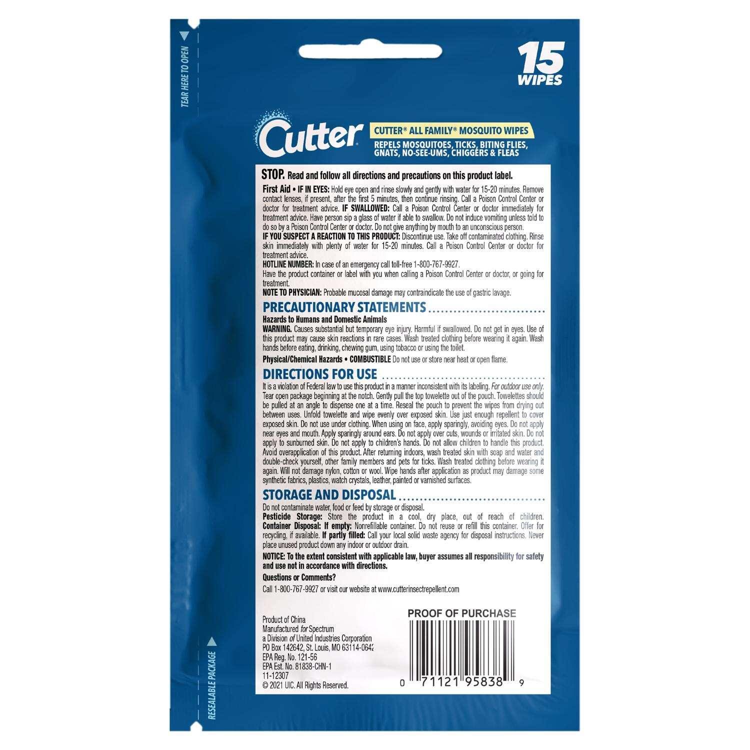 Cutter All Family Mosquito Wipes are soft on skin but tough on bugs. These towelettes are formulated with 7.15 percent DEET formula to repel mosquitoes, including those that may transmit the Zika, West Nile, Dengue and Chikungunya viruses. Cutter All Family Mosquito Wipes never feel greasy or oily on your skin. The gentle but effective formula also wards off other annoying insects, including ticks, biting flies, gnats, no-see-ums, chiggers and fleas. For outdoor use only. Cutter All Family Mosquito Wipes allow for controlled application of insect repellent to face, ears and neck. Resealable package for multiple outings.