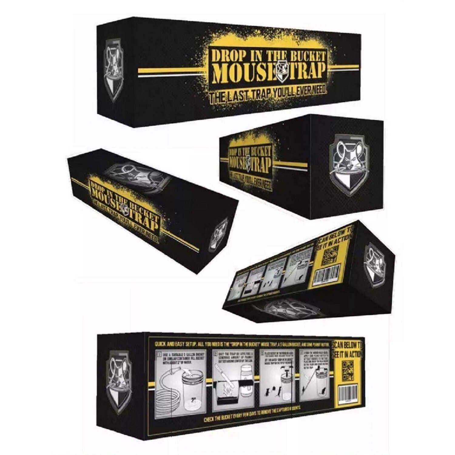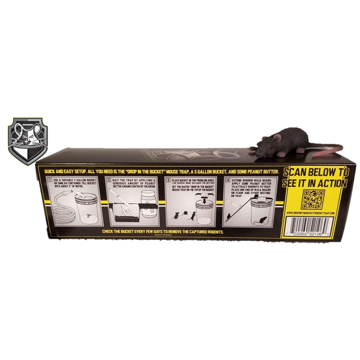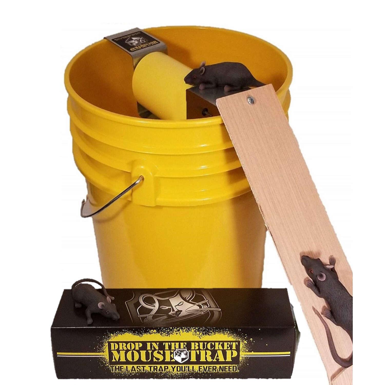 The Drop in the Bucket Mouse Trap is a mechanism that holds a rotating drum, baited with peanut butter. The baited mechanism is placed on top of a 5 gallon bucket. The ramp that goes from the ground to the top of the bucket, is included. This makes it easier for the mouse to get up on top where the action is. But as you probably already know, a mouse can literally go anywhere! No mouse can resist the tantalizing aroma of peanut butter, and being the nimble little creature that he is, he hastily ventures out onto the drum to enjoy his new found feast without a worry in the world. But, to his surprise...and dismay...as his weight shifts, so does the drum. As it spins, down into the bucket he goes! Trying to jump off the drum only makes his fall faster and more certain!