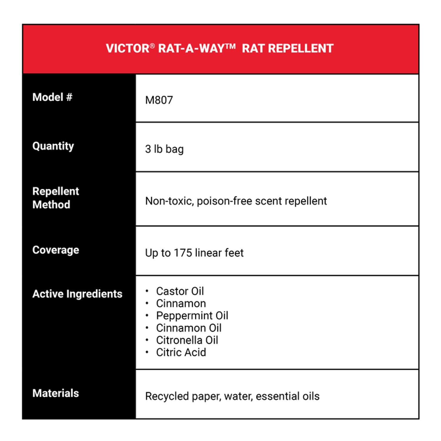 Stop rodents before they have a chance to invade your home with Victor Rat-A-Way Rat Repellent! This all-natural rat repellent is a safe and effective way to deter would-be rodent invaders. It utilizes a blend of poison-free essential oils, such as peppermint oil, which is shown to be unpleasant to rodents. When faced with the odor, rats will typically look for shelter elsewhere. To make it easy to use, the essential oils are infused into recycled paper pellets. The winning combination of non-toxic essential oils and biodegradable materials creates a product that won’t harm your pets, your family, or the environment when used as directed. Get started by spreading Victor Rat-A-Way Rat Repellent in 1-3 inch-wide bands around the perimeter of your house, barn, woodpiles, trashcans, stables, and any other area you’re trying to protect from rodents. The thicker the band is, the more effective your repellent efforts will be. Once the scent begins to fade or the pellets start to disintegrate, approximately every 2 to 3 weeks, reapply Rat-A-Way to desired areas. If experiencing excessive rain and inclement weather, you may need to reapply sooner for best results. The convenient 3 lb bag offers plenty of coverage – up to 175 linear feet – so you can protect more areas of your property.