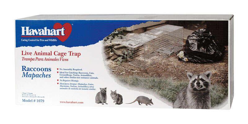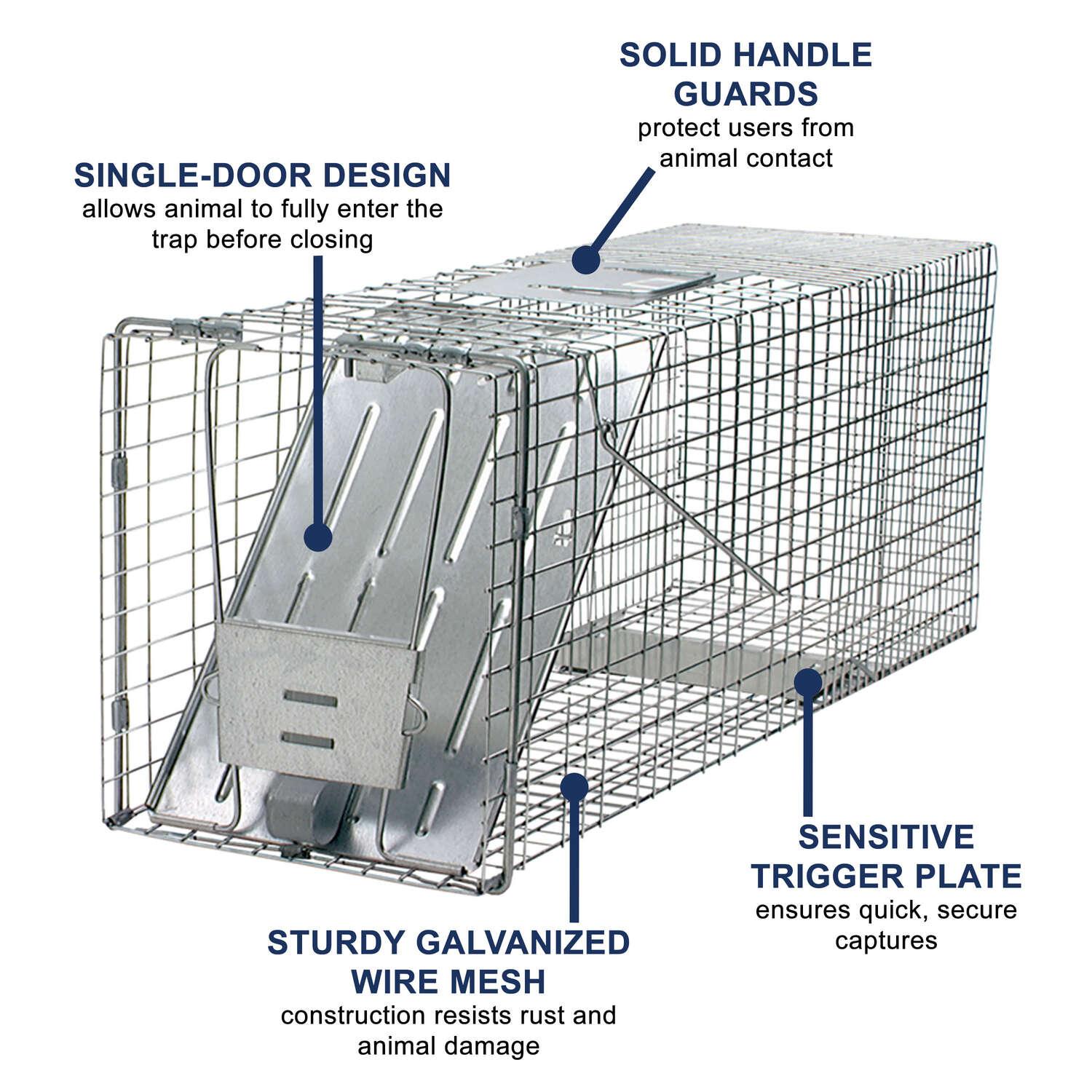 The Havahart Large 1-Door Animal Trap is an all-metal, live cage trap designed by professional trappers. It features a spring-loaded door for safe, secure catches. Animal control officers also trust and use these live animal traps -- so can you! Use it to trap raccoons, opossums, skunks, armadillos, groundhogs and other similar-sized pest animals. Havahart one-door animal cage traps are constructed of sturdy, rust-resistant wire mesh with steel reinforcements and measure approximately 32 inches long. Each trap is built to last and galvanized for maximum resistance to rust and corrosion, making it an ideal solution for your long-term trapping goals. This trap includes mesh openings that are smaller than competing traps of comparable size, which prevent escapes and stolen bait. A solid, locking door and sensitive trigger ensures quick, secure capture that targets a specific animal size while eliminating undesired catches. Solid handle guards also protect the user while transporting an animal. At the same time, smoothed internal edges protect and prevent the animal from injuring itself.