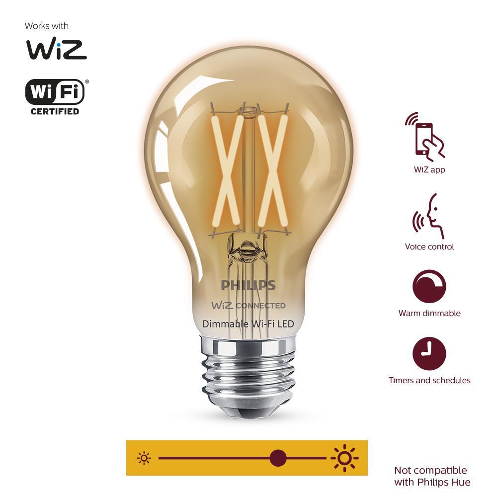 Philips Smart Wi-Fi LED lighting puts you in complete control of your lighting with smart bulbs that are easy to use, functional, and affordable. We’ve made all your favorite high-quality Philips bulbs smarter, just connect them to your existing Wi-Fi network. Smart Dimming Amber – create a cozy atmosphere with a warm, vintage look. Control your lights wherever you are using the WiZ app or your favorite compatible voice control device. Product requires a WiFi connection to operate wirelessly. Compatible with WiZ apps and products along with Google Assistant, Amazon Alexa, and Siri Shortcuts