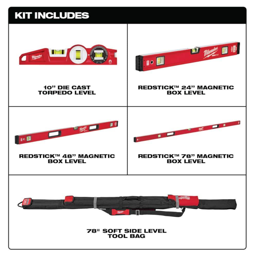 • Complete Set: Includes 10 in. torpedo, 24 in., 48 in., and 78 in. box levels plus 78 in. soft‑side carrying bag.