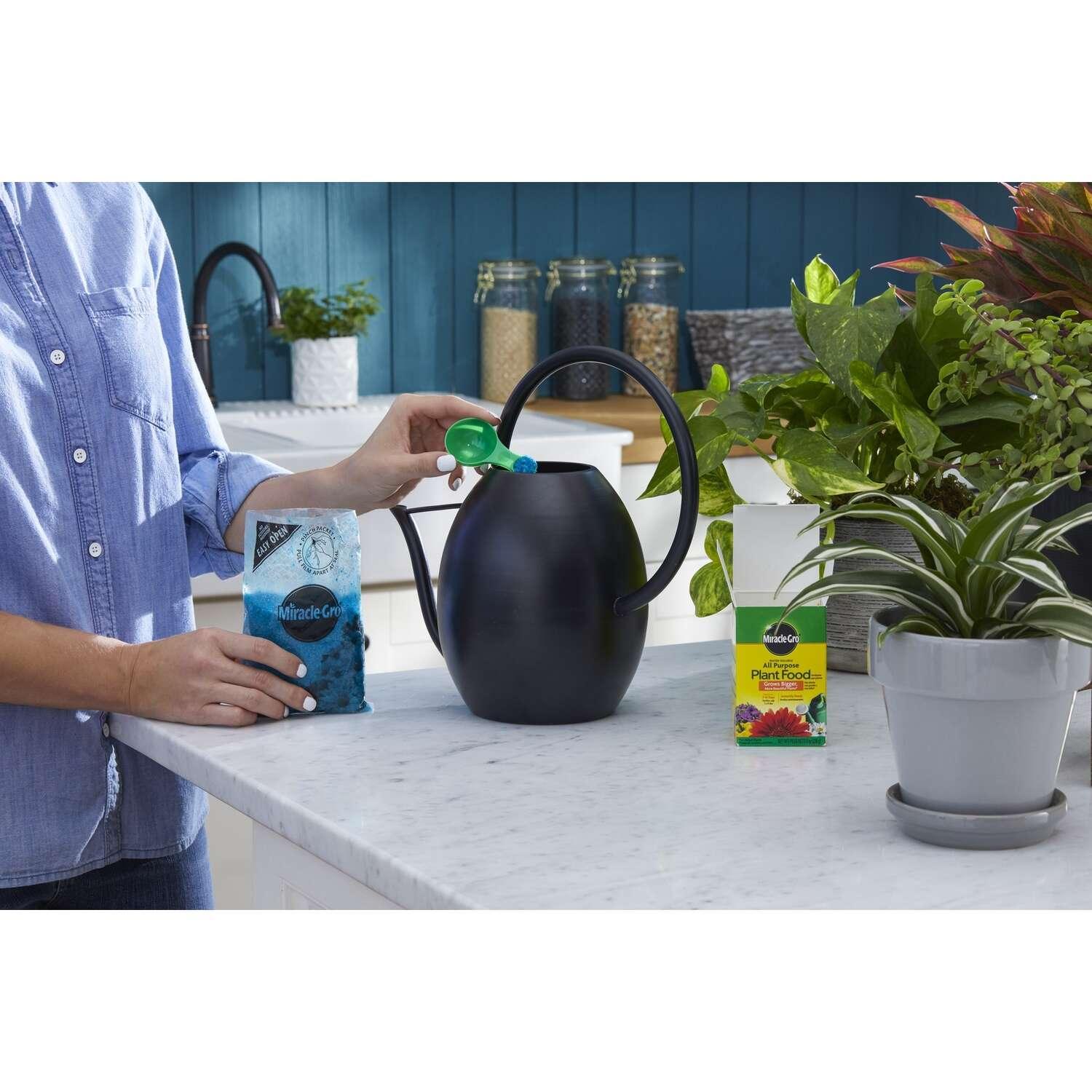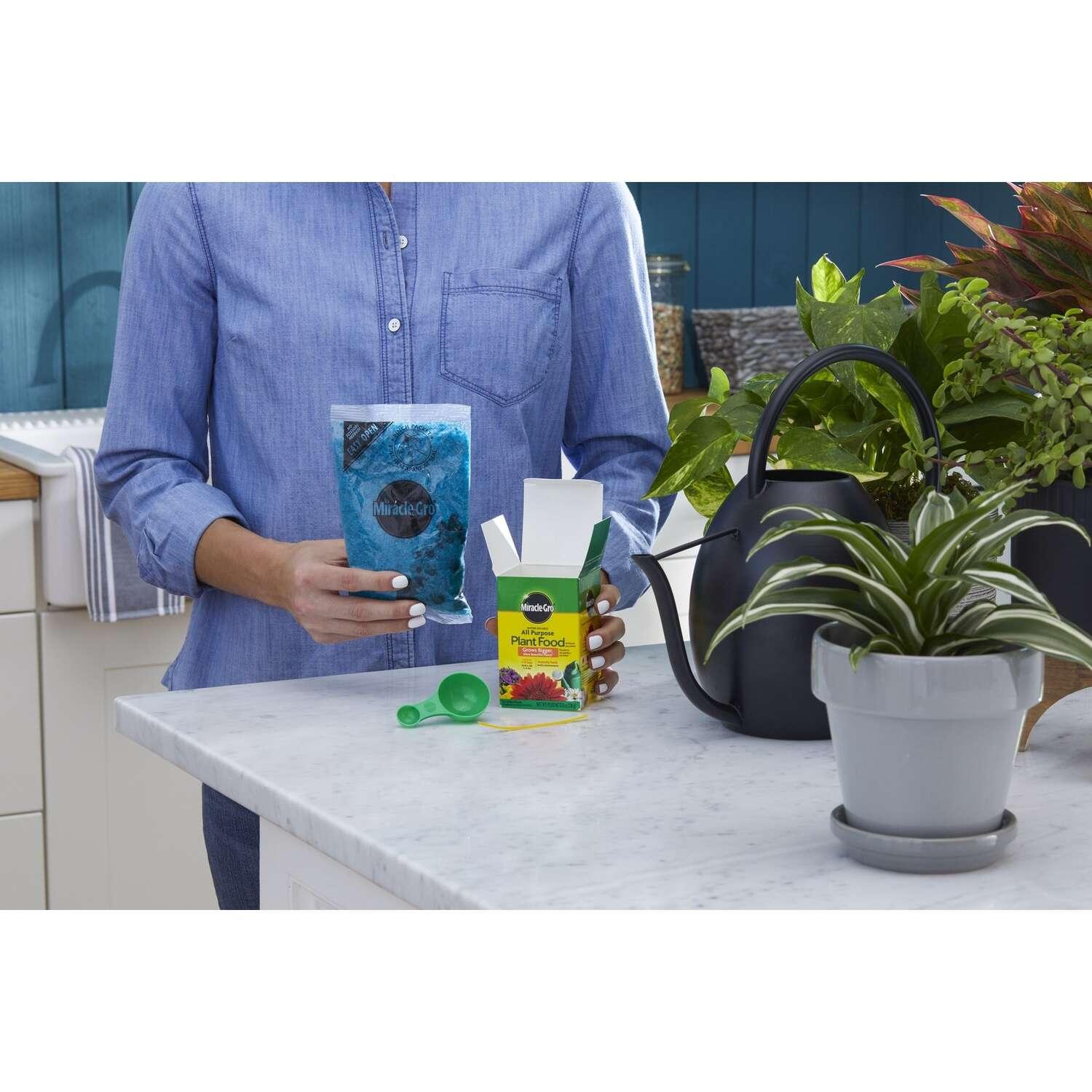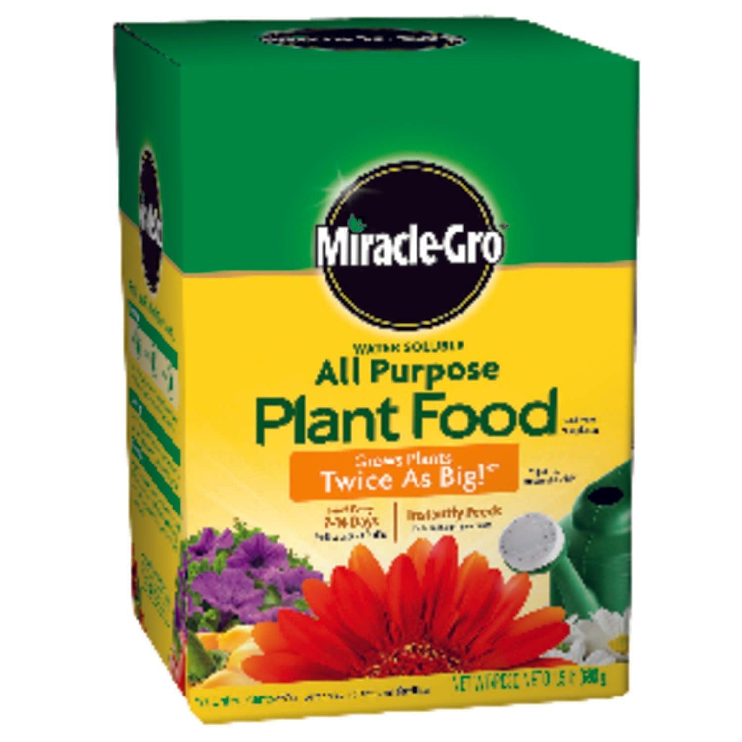 Full of essential nutrients, Miracle-Gro Water Soluble All Purpose Plant Food instantly feeds vegetables, trees, shrubs and houseplants to grow bigger and more beautiful than unfed plants. Simply feed them every 1-2 weeks. The formula is safe for all plants and is guaranteed not to burn when used as directed. Get beautiful results with Miracle-Gro.
