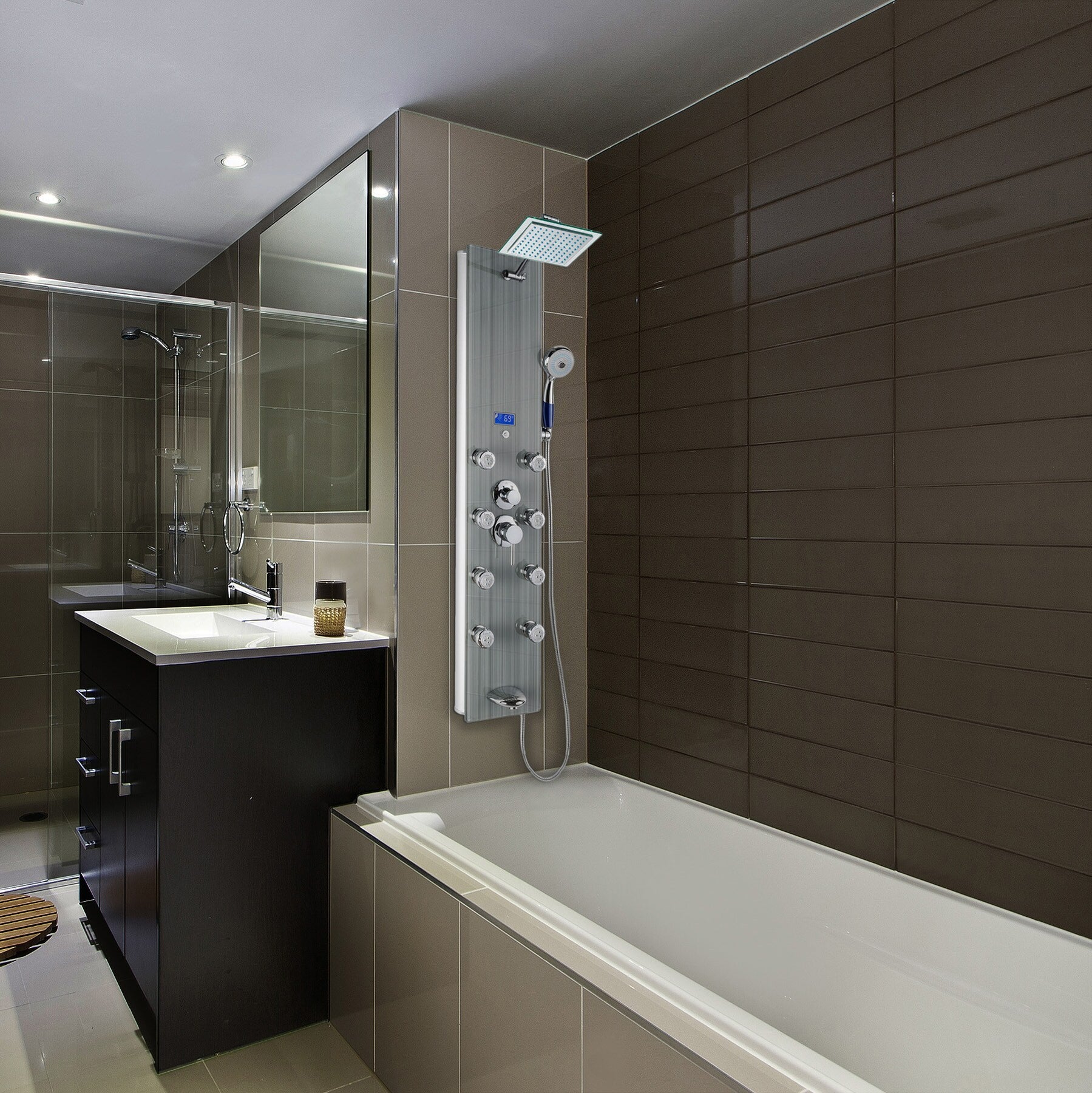 - All-in-One Shower Experience: Overhead rainfall, handheld wand, 8 body massage jets, and tub spout