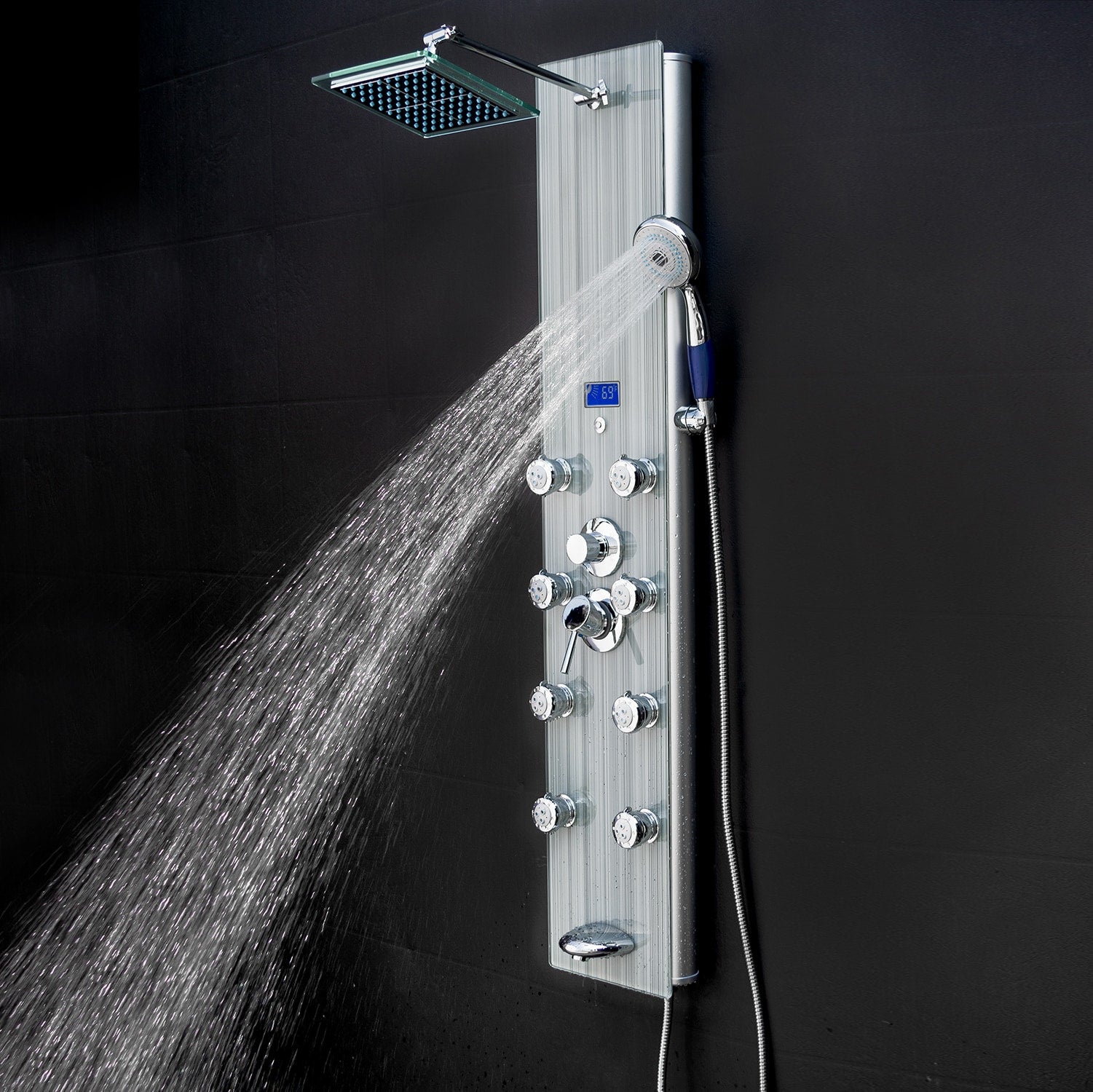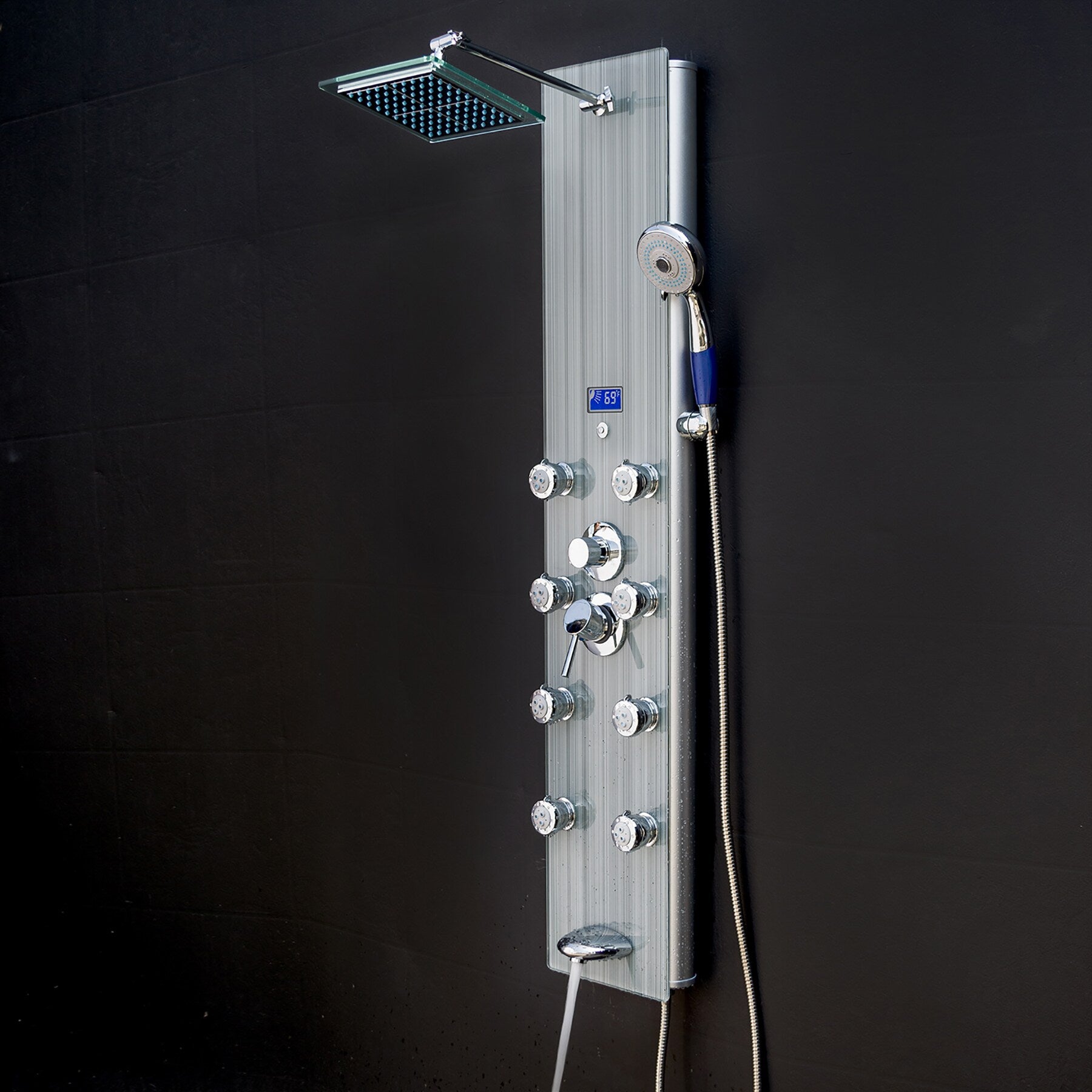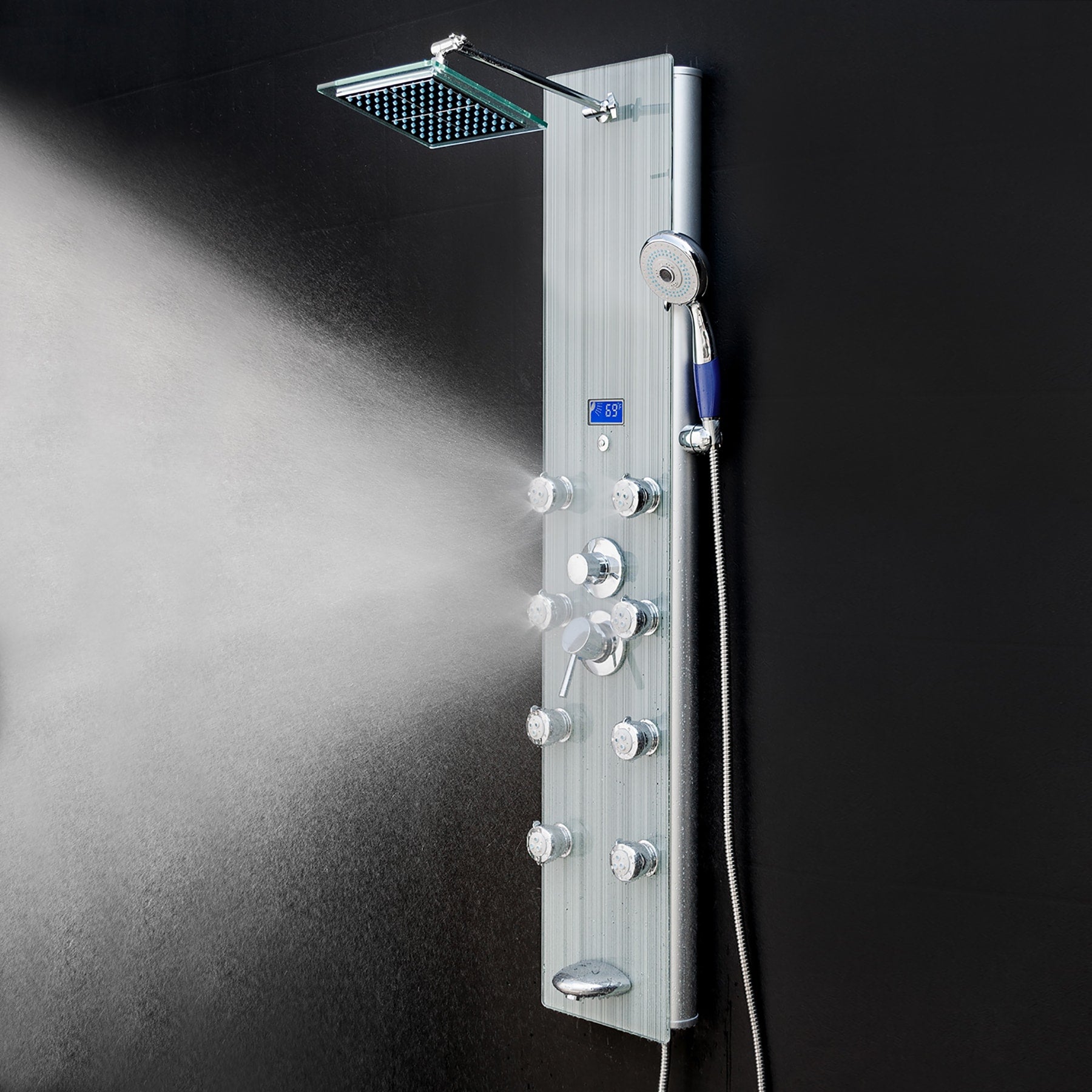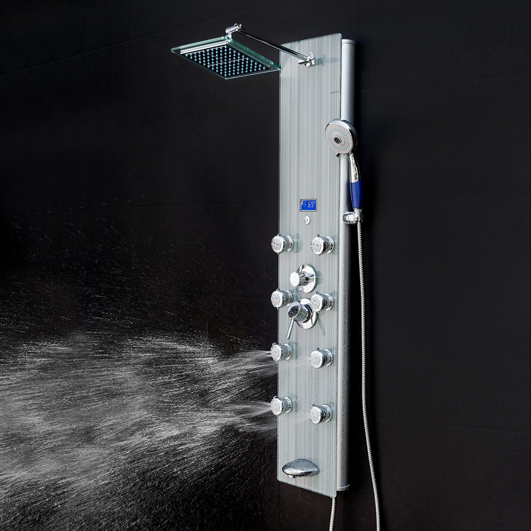 This AKDY 52-in brushed stainless steel shower panel upgrades any bath with a rainfall head, handheld wand, and 8 body jets. An LED temperature display and built-in pressure balancing valve deliver comfort and control, while the tempered-glass overlay offers a sleek, modern finish.