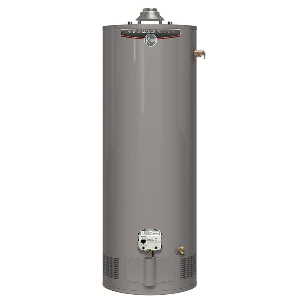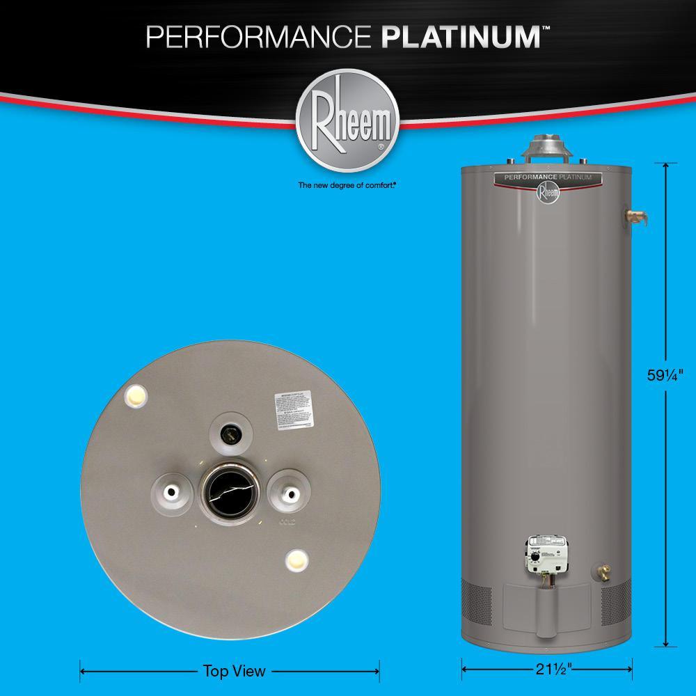 The Rheem Performance Platinum 50 Gal. Natural Gas Tall Water Heater comes with a 40,000 BTU/hour environmentally friendly low NOx burner that provides ample hot water for households with 3 to 5 people. The push button ignition system ensures safe and easy startup. Its maintenance free combustion air intake system means there are no filters to clean and replace. A premium grade anode rod provides long lasting tank protection. Factory installed temperature and pressure relief valve and 3/4 in. water connections are included with the water heater for easy installation.