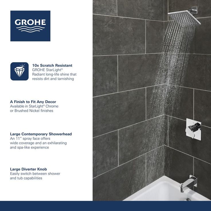 The GROHE Tallinn Single-Handle Tub/Shower in Chrome delivers both modern style and relaxation in one urban-chic set. Featuring clean lines, geometric forms and a minimalist attitude, it consists of a tub spout, showerhead, and control valve. The large showerhead is equipped with GROHE DreamSpray technology, which optimizes water distribution for a satisfying shower experience with even, consistent coverage, and GROHE SpeedClean spray nozzles, which resist limescale buildup. All are finished in GROHE StarLight Chrome, a dirt- and scratch-resistant finish that requires little maintenance and will look good as new even after decades of use.