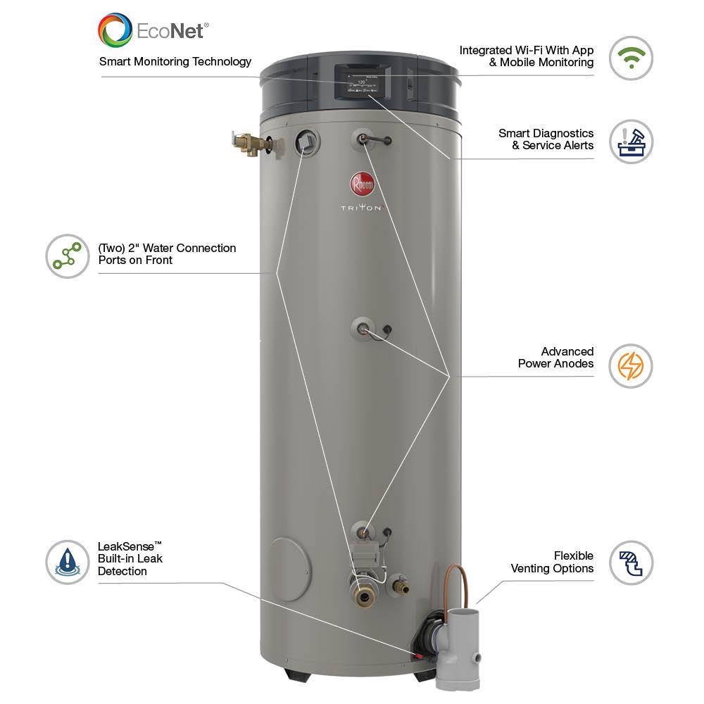 The Rheem Triton Commercial Water Heater is the most intelligent high efficiency commercial gas water heater on the market and features a universal design so you can easily have your existing water heater replaced regardless of brand. It's designed to help protect your business with features like LeakSense. Plus, easy-to -own features like preventive maintenance alerts mean you can focus on your business without worrying about your water heater. Enjoy built-in intelligence, installation versatility, extended tank life, integrated Wi-Fi and the ability to detect and prevent water heater problems all with Rheem Triton.