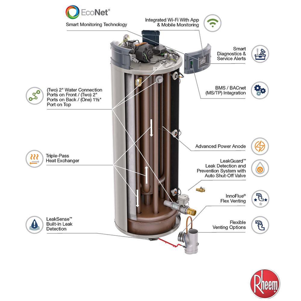 • Easy retrofit across brands: five water connection points, a variety of flexible venting options and built-in condensate neutralizer make it easy to replace any commercial gas water heater brand