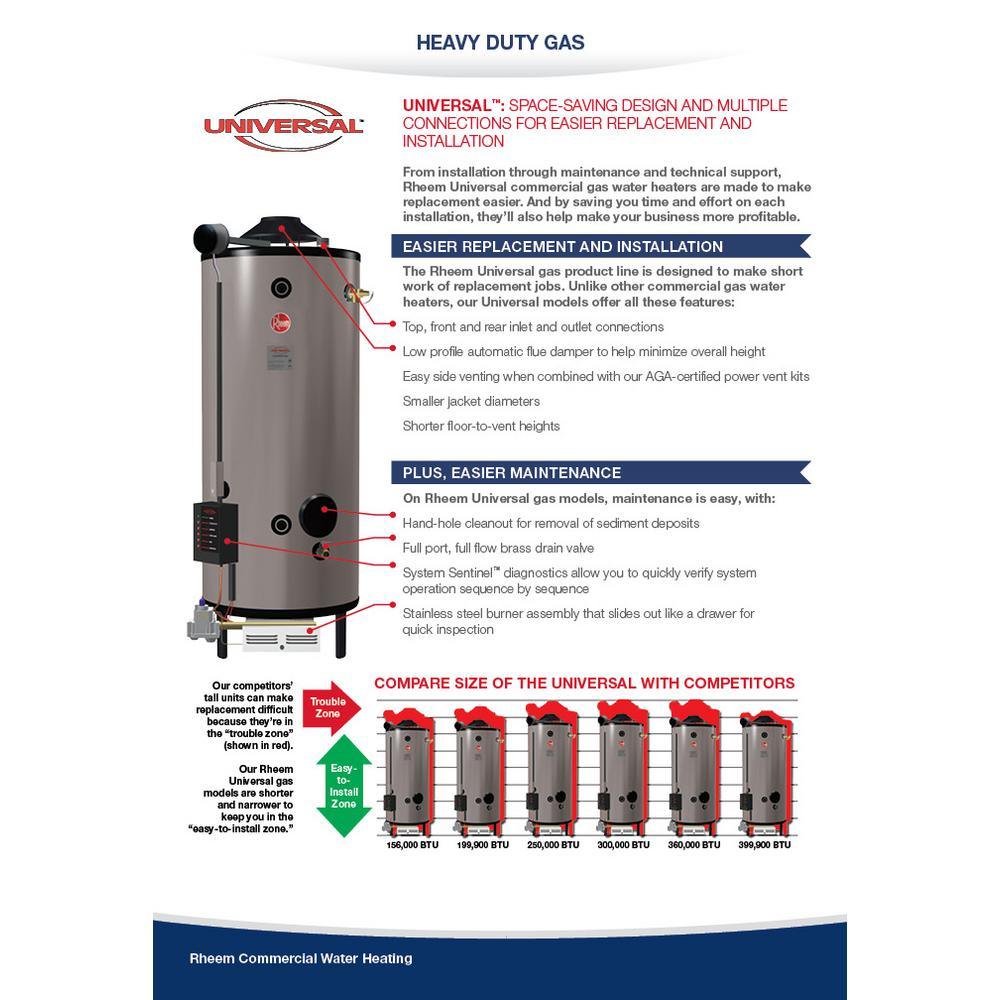 Rheem Commercial Universal Gas Water Heaters are designed to fit into tight retrofit applications and have the features and capacity to meet heavy duty demands. The tighter the commercial retrofit, the more you will appreciate how the Universal's compact size and multiple water connections simplify installations. Top, Front and Rear water inlets/outlets offer installation flexibility giving this water heater the name: Universal. Please Note: This model requires a 120-Volt power source.