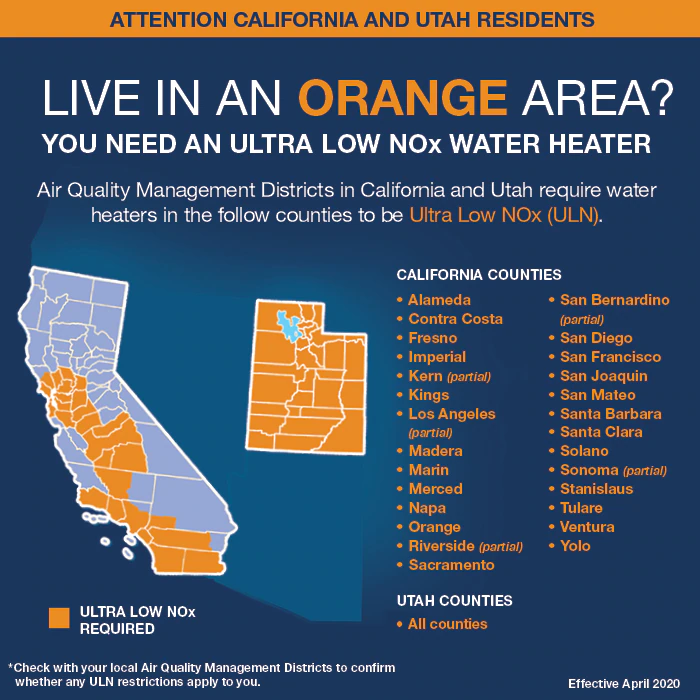 - California and Utah residents: this water heater does not meet Ultra-Low Nox (ULN) emissions requirements regulations prohibit the sale, shipment or installation of this water heater in any air quality district that requires ULN water heaters, please refer to the maps below to confirm if your home is in a district that requires ULN emission water heaters and if so please select an approved ULN model