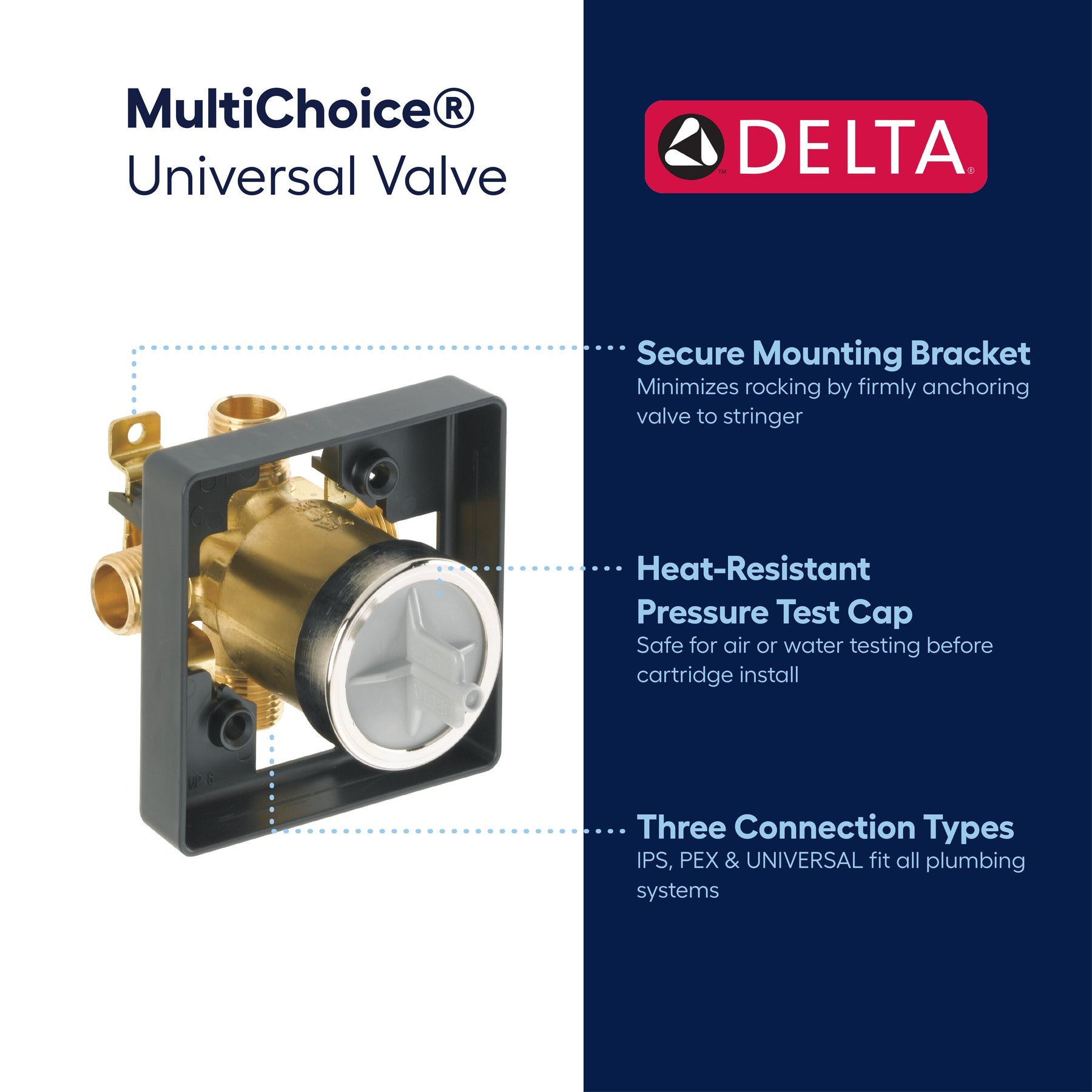 Upgrade your shower with Delta’s MultiChoice Universal valve body, built from durable brass for long-lasting performance. The R10000-LBX accepts single, dual, or dual thermostatic cartridges and offers IPS, PEX, and Universal connection options for flexible installation.