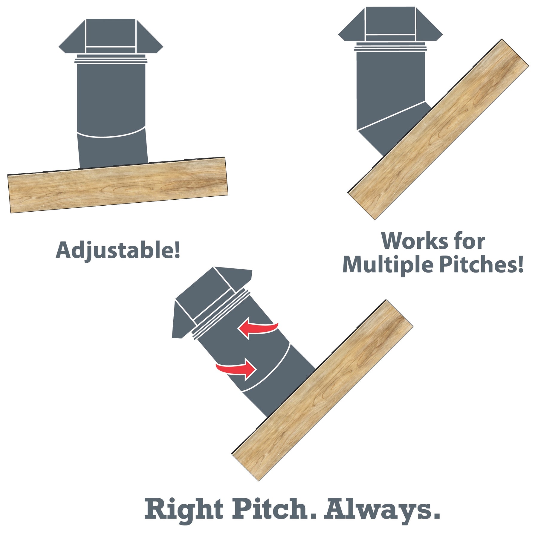 • Adjustable Pitch Design: Rotate base, stack and cap to match various roof slopes
