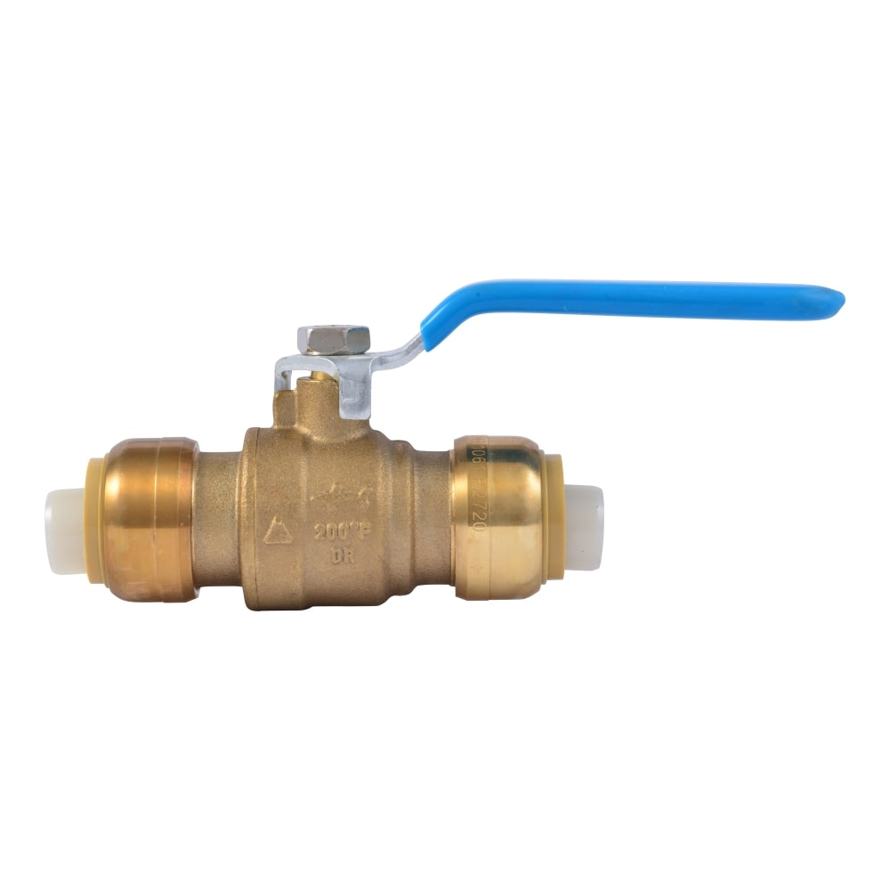 Durable SharkBite brass ball valve with push-to-connect ends for fast, tool-free installation. Compatible with PEX, copper, CPVC, and PE-RT, it provides reliable shut-off for potable water and hydronic applications.