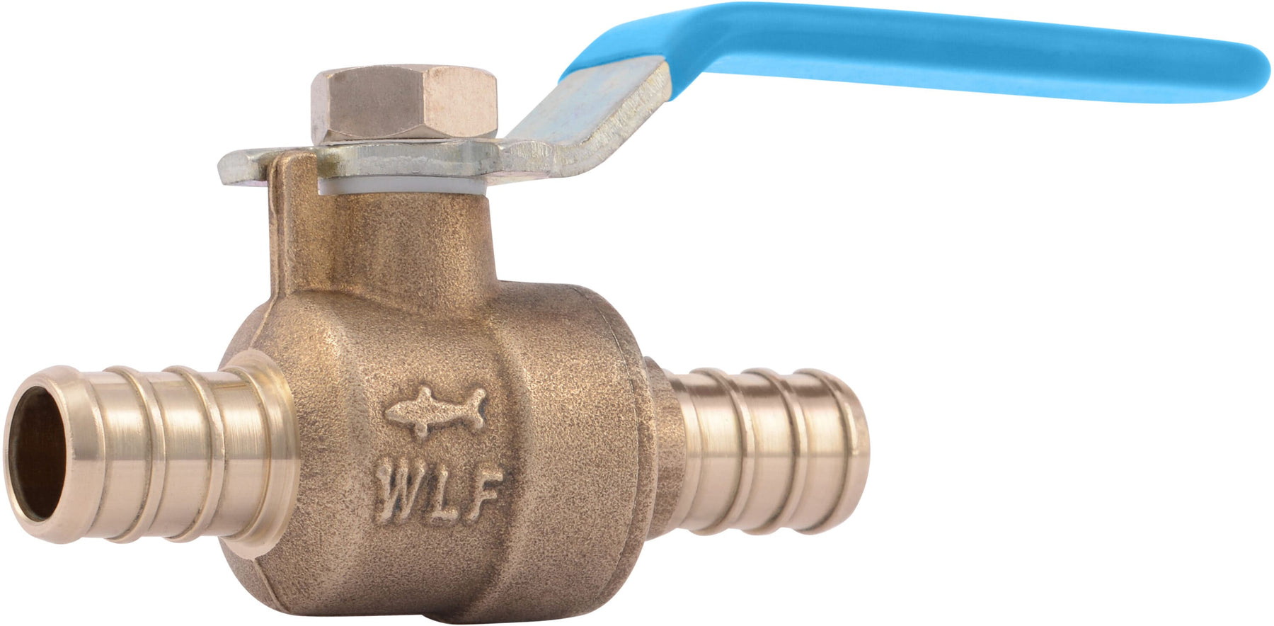 Durable lead-free brass ball valve for controlling flow in PEX plumbing systems. Features PEX barb connections and a single-lever handle for quick shut-off in potable water applications.