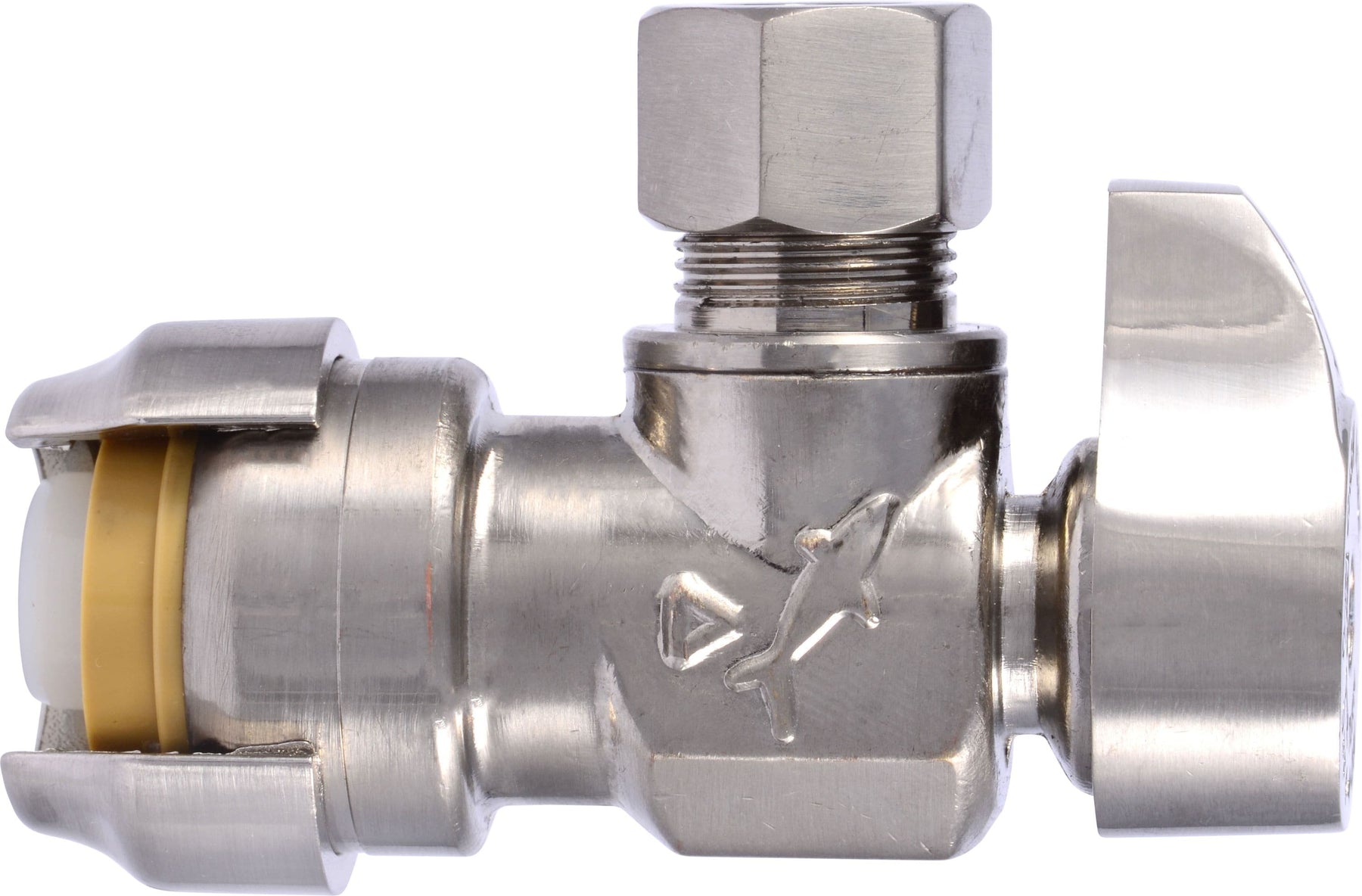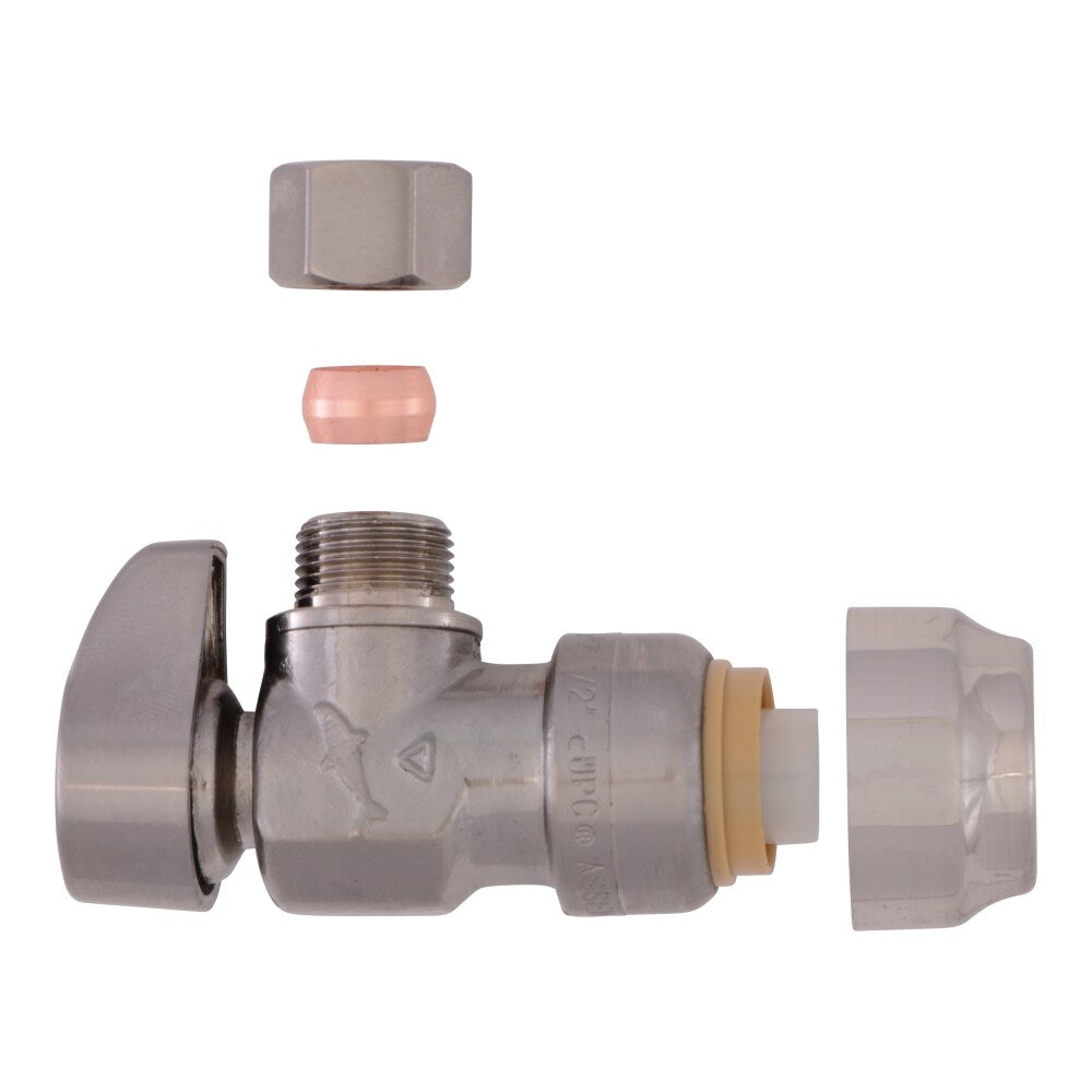 Install shut-off control fast with this SharkBite quarter-turn angle stop valve. The push-to-connect 1/2-in inlet links directly to PEX, copper, CPVC or PE-RT, while the 3/8-in OD compression outlet connects to faucet or toilet supplies. Corrosion-resistant DZR brass with a brushed nickel finish and a chrome-plated body delivers durability and clean style.