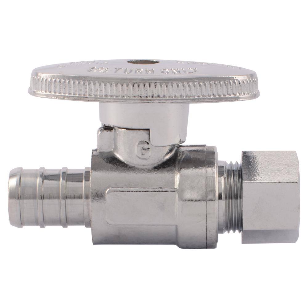 Durable lead-free brass straight stop valve for PEX to compression connections. Quarter-turn operation provides quick, reliable shutoff for faucets or toilets. Compatible with PEX-A, PEX-B and PEX-C systems using crimp or clamp methods.