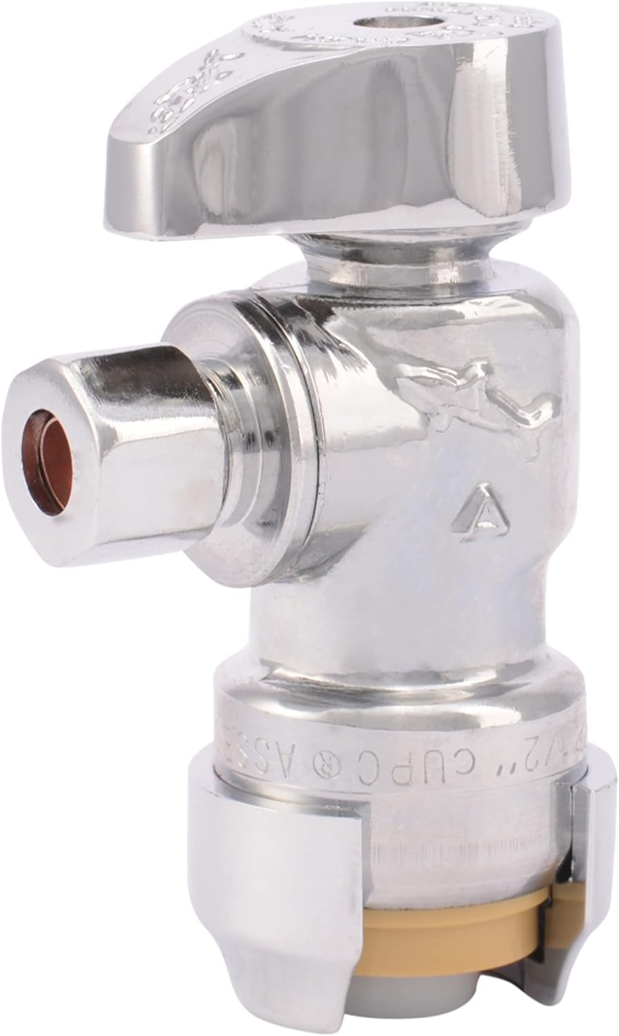 Quarter-turn angle stop valve with 1/2 in push-to-connect inlet and 1/4 in compression outlet for fast, tool-free shutoff. Brass construction with sleek chrome finish; compatible with PEX, copper, CPVC, PE-RT, and SDR-9 HDPE pipes.