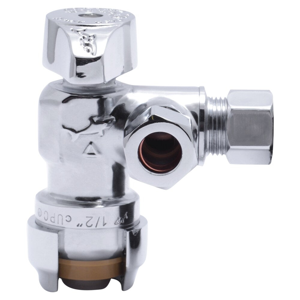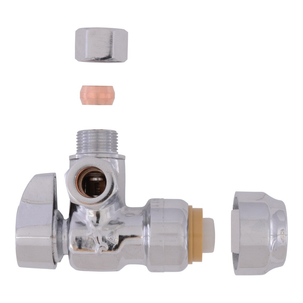 This SharkBite quarter-turn angle stop valve provides a fast, tool-free way to control water flow to fixtures. The chrome-plated, lead-free brass body uses push-to-connect technology on the inlet and a 3/8-in OD compression outlet for reliable, watertight performance.