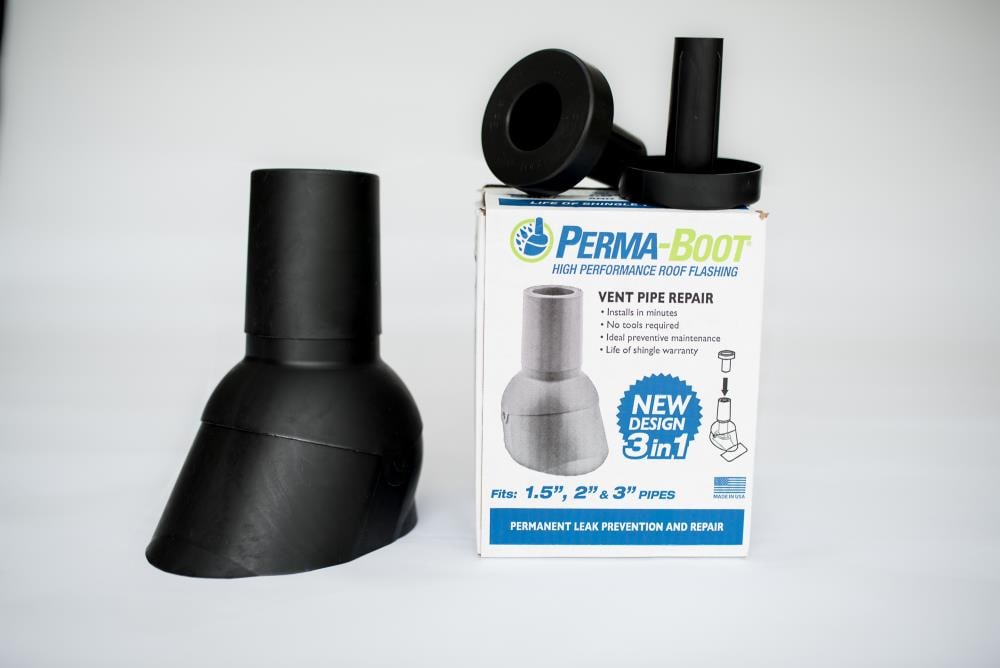 A gasket-less repair boot that slides over existing roof vent boots to stop and prevent leaks. The Perma-Boot 3-in-1 fits 1-1/2 in, 2 in, and 3 in pipes and installs in minutes with no tools, delivering durable, weather-resistant protection for standard roof pitches.