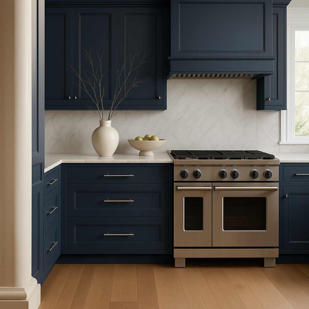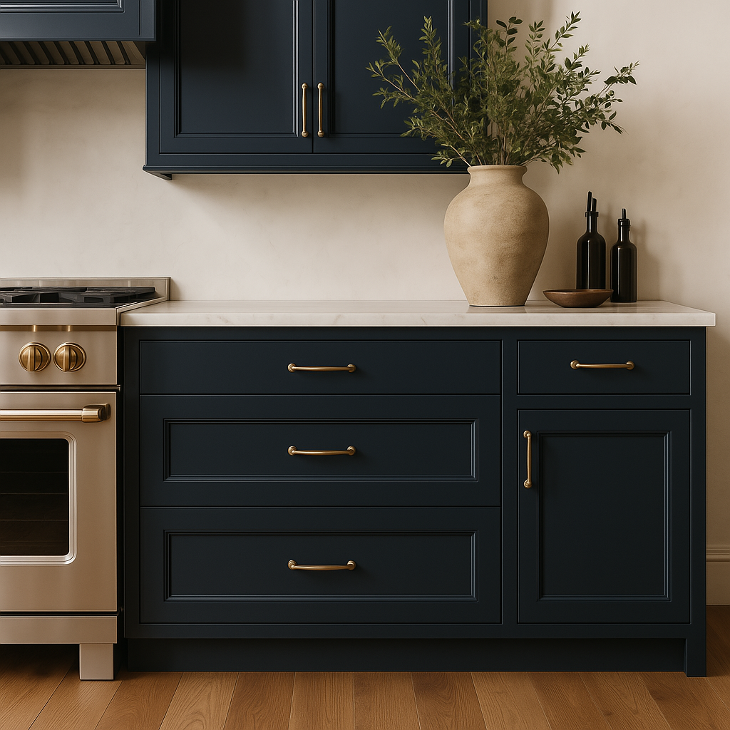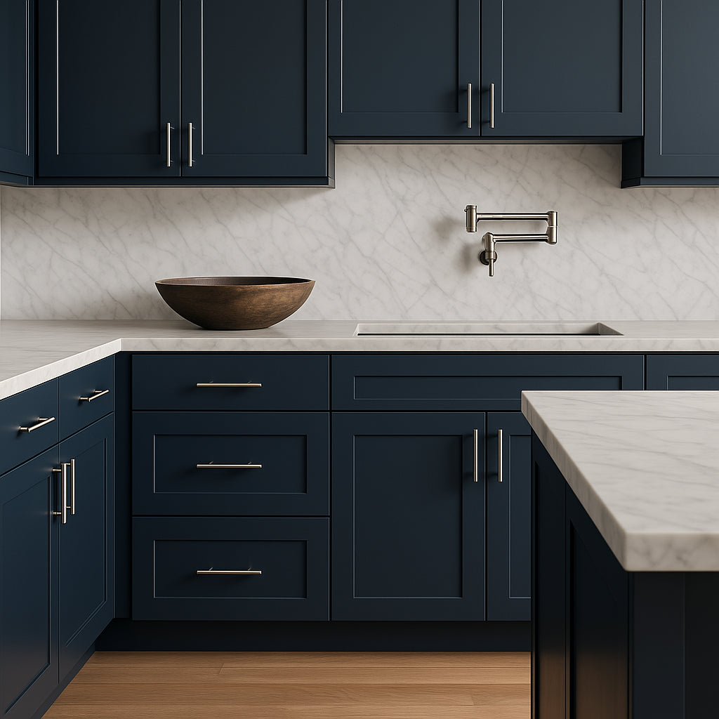 The Hampton Bay Avondale Shaker Drawer Base Cabinet combines style and functionality with its ink blue finish and soft-close drawers. Made from durable plywood, it offers ample storage space and complements various kitchen designs.