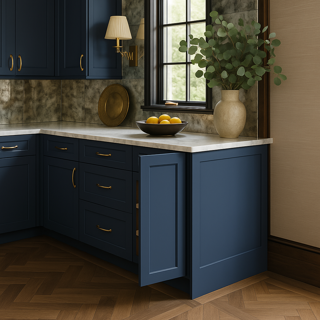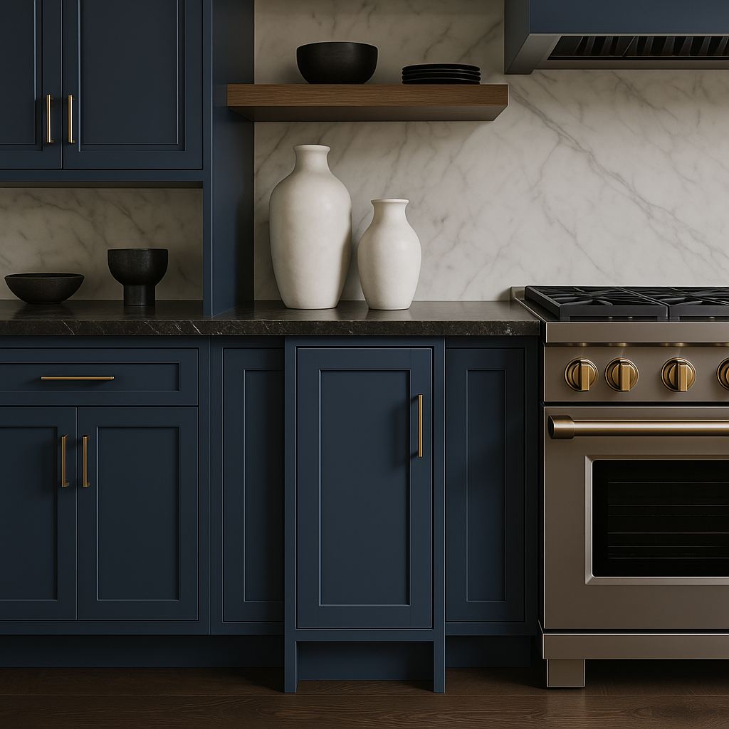 - Elegant Design: Deep blue thermofoil finish with shaker-style doors.