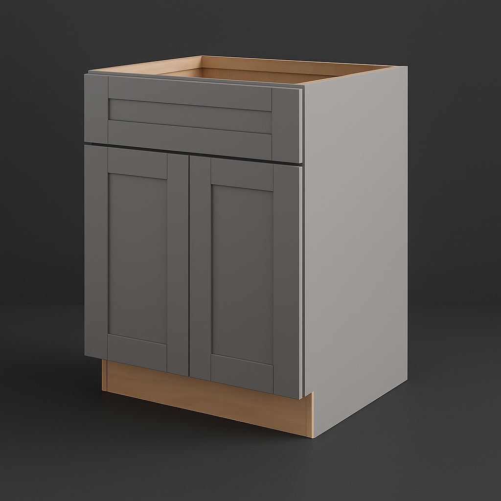 The Richmond Vesuvius Gray Sink Base Cabinet by MILL'S PRIDE combines durable plywood construction with a stylish shaker design. Featuring soft-close doors and a thermofoil finish, this cabinet is perfect for modern kitchens.
