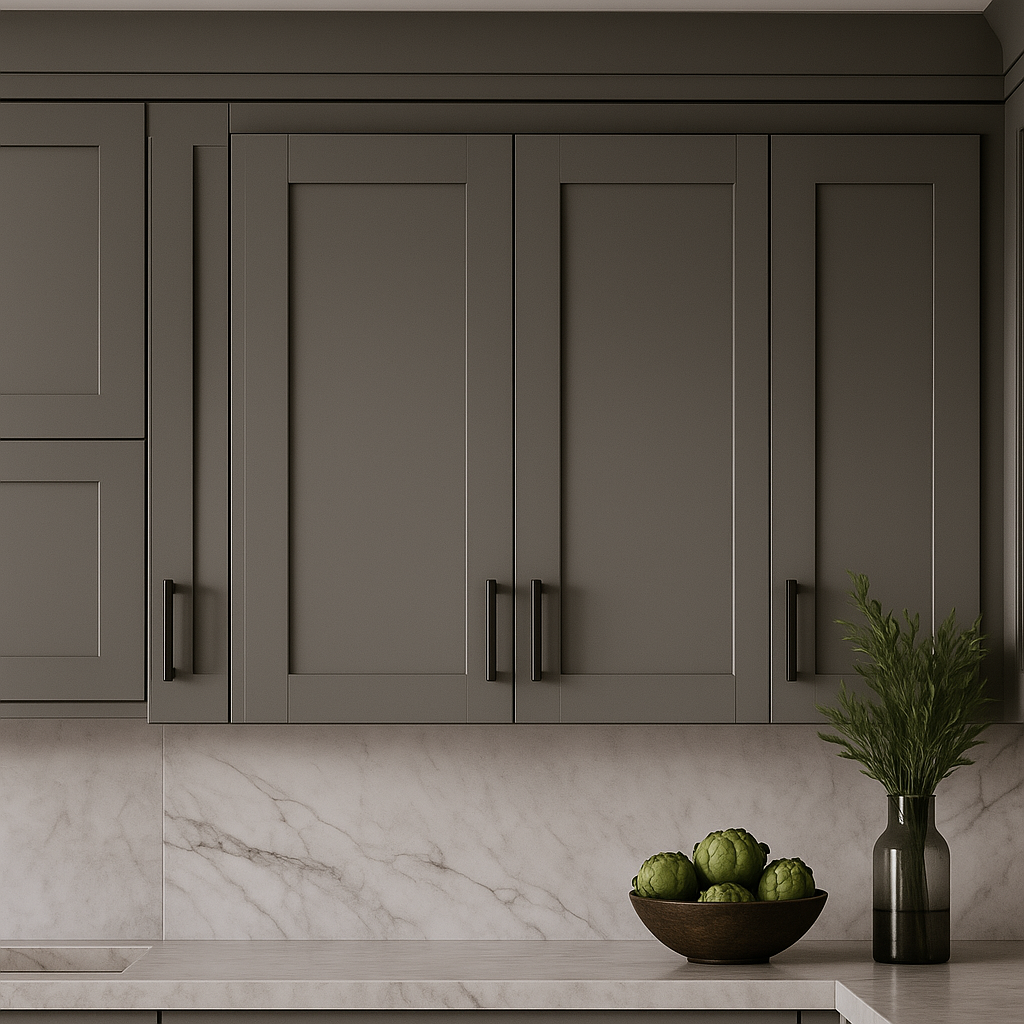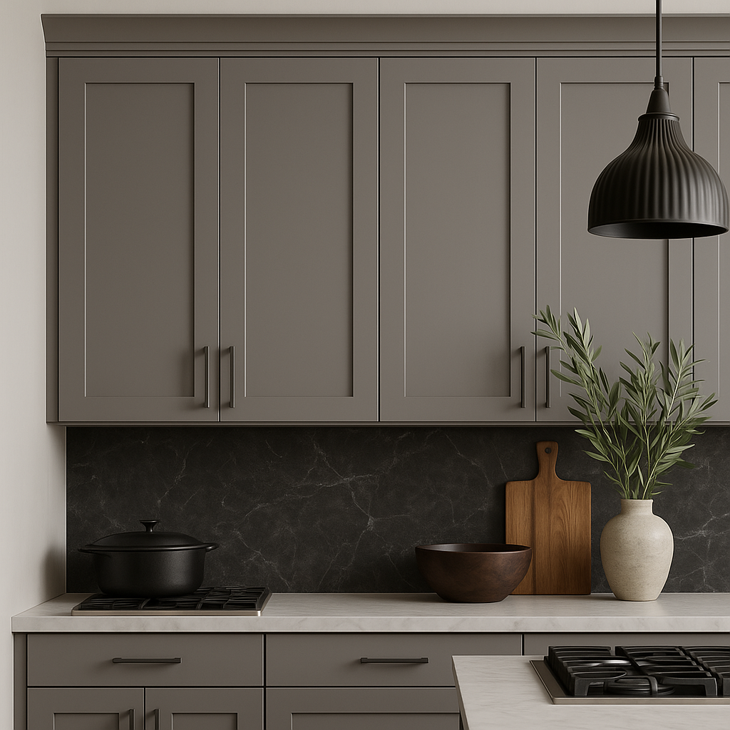 - Stylish Design: Shaker-style doors with a Vesuvius Gray finish.