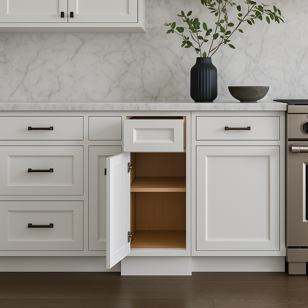 Kitchen Cabinet Features Adjustable Shelves, Finished Interior, Full Extension Drawers, Soft Close Doors, Soft Close Drawers