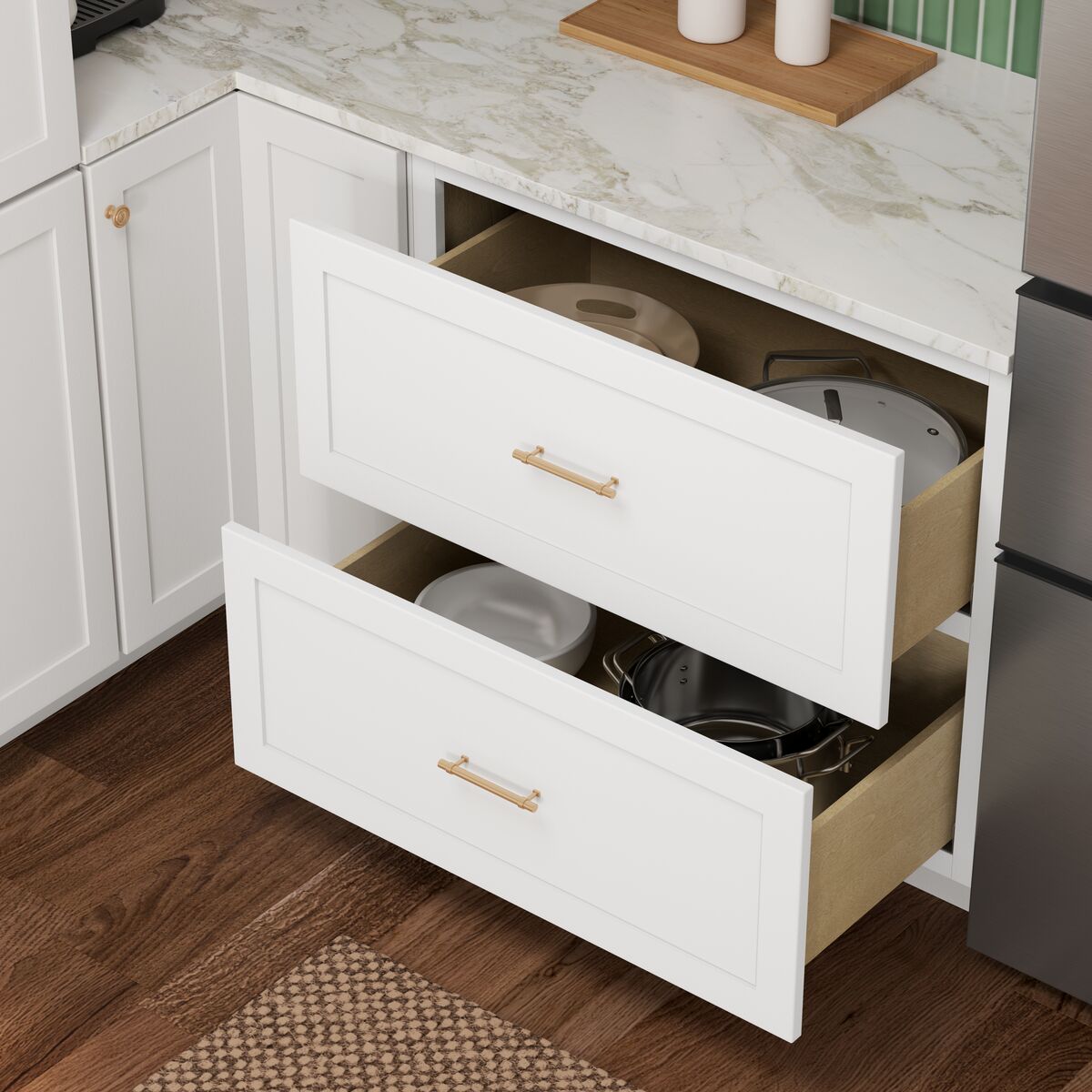 The Whalen Click-IT Enfield 2-Drawer Base Cabinet is a top-tier ready-to-assemble option designed with Threespine technology for simple, tool-less setup. Made from premium birch plywood with a classic white finish, it offers durability and style, fitting seamlessly into both modern and traditional home interiors.