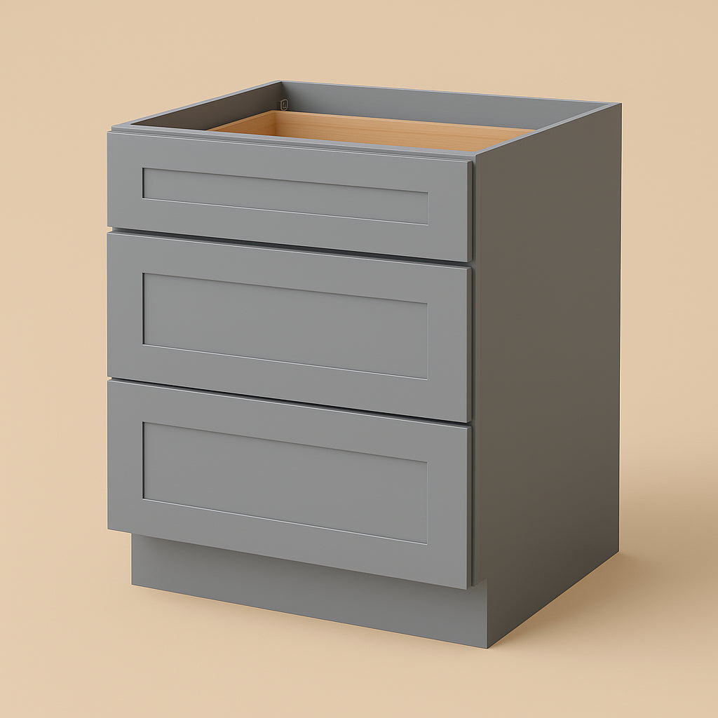 The WOWOW Grey Plywood Drawer Base Cabinet offers a stylish and functional solution for kitchen storage. Featuring three soft-close drawers, durable plywood construction, and a painted finish, this cabinet is designed for modern kitchens.