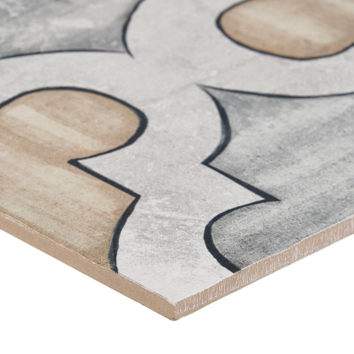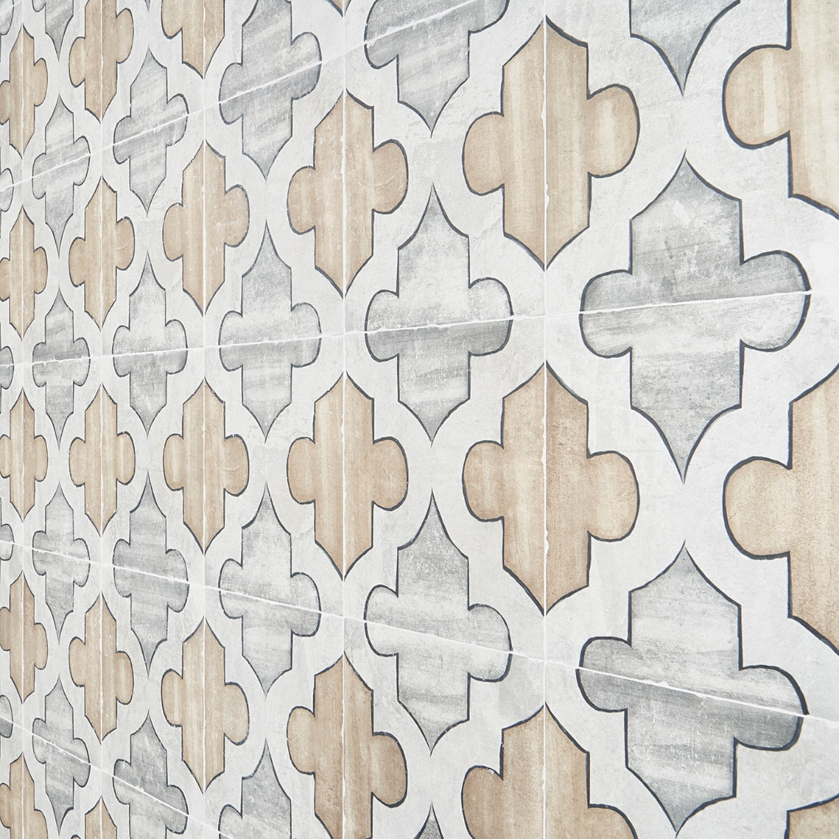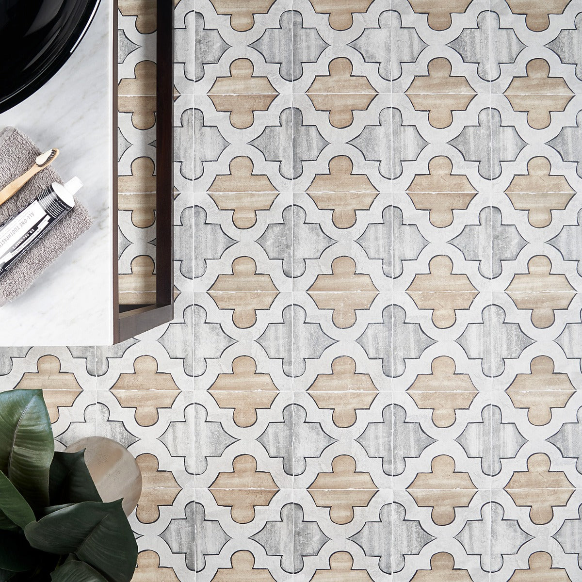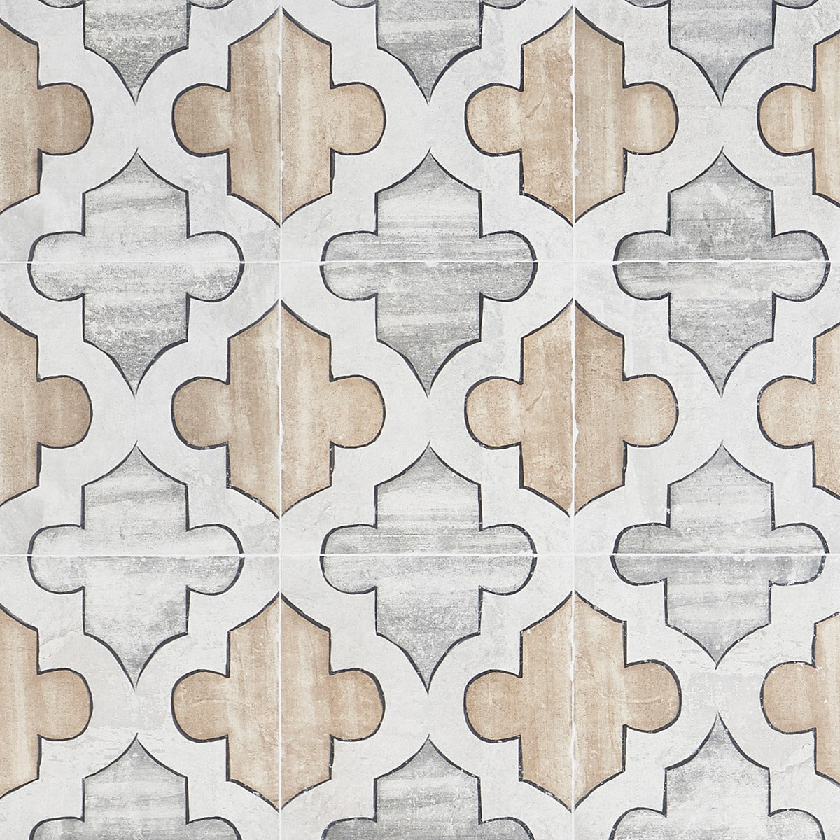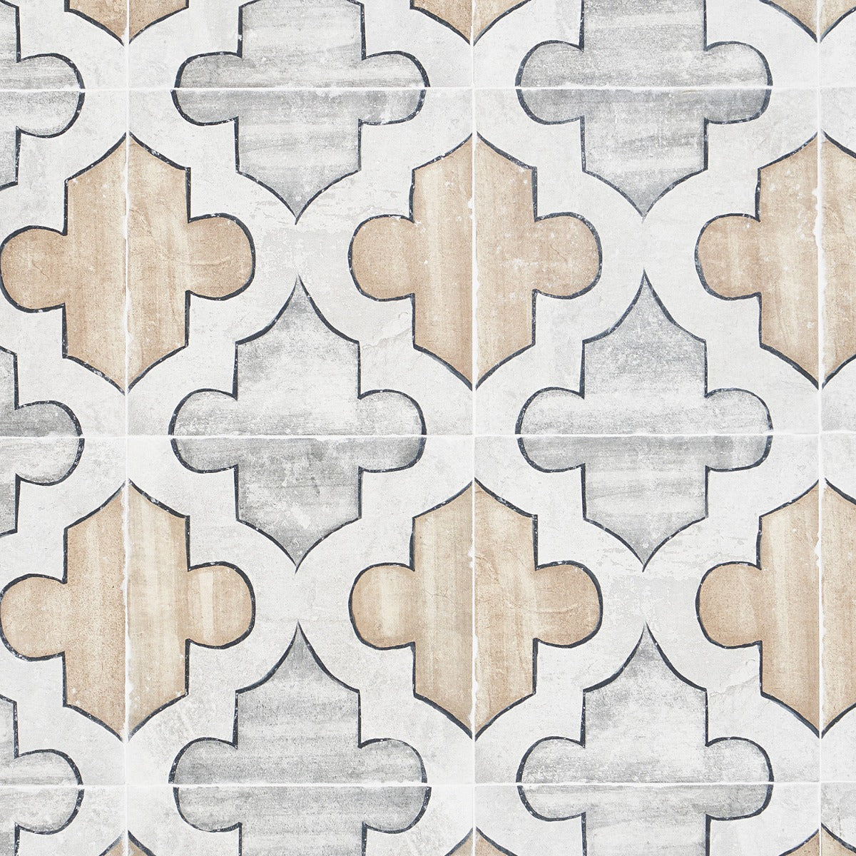 The Alesso Deco Picos Beige 8x8 Matte Porcelain Tile combines the durability of porcelain with the artistry of an encaustic look. Inspired by Andalusian design, it features a quatrefoil pattern in beige and gray hues, perfect for adding a touch of elegance to any space.