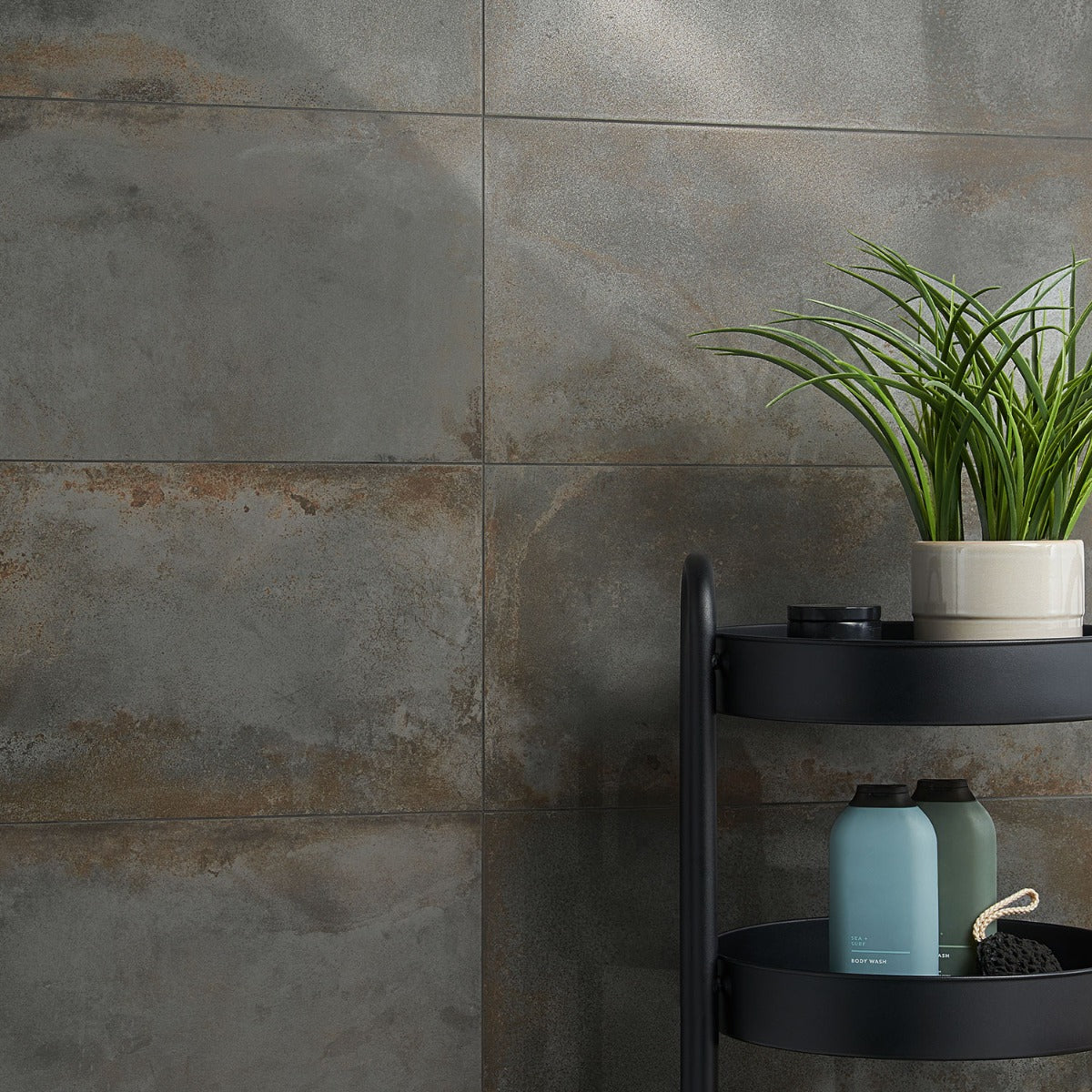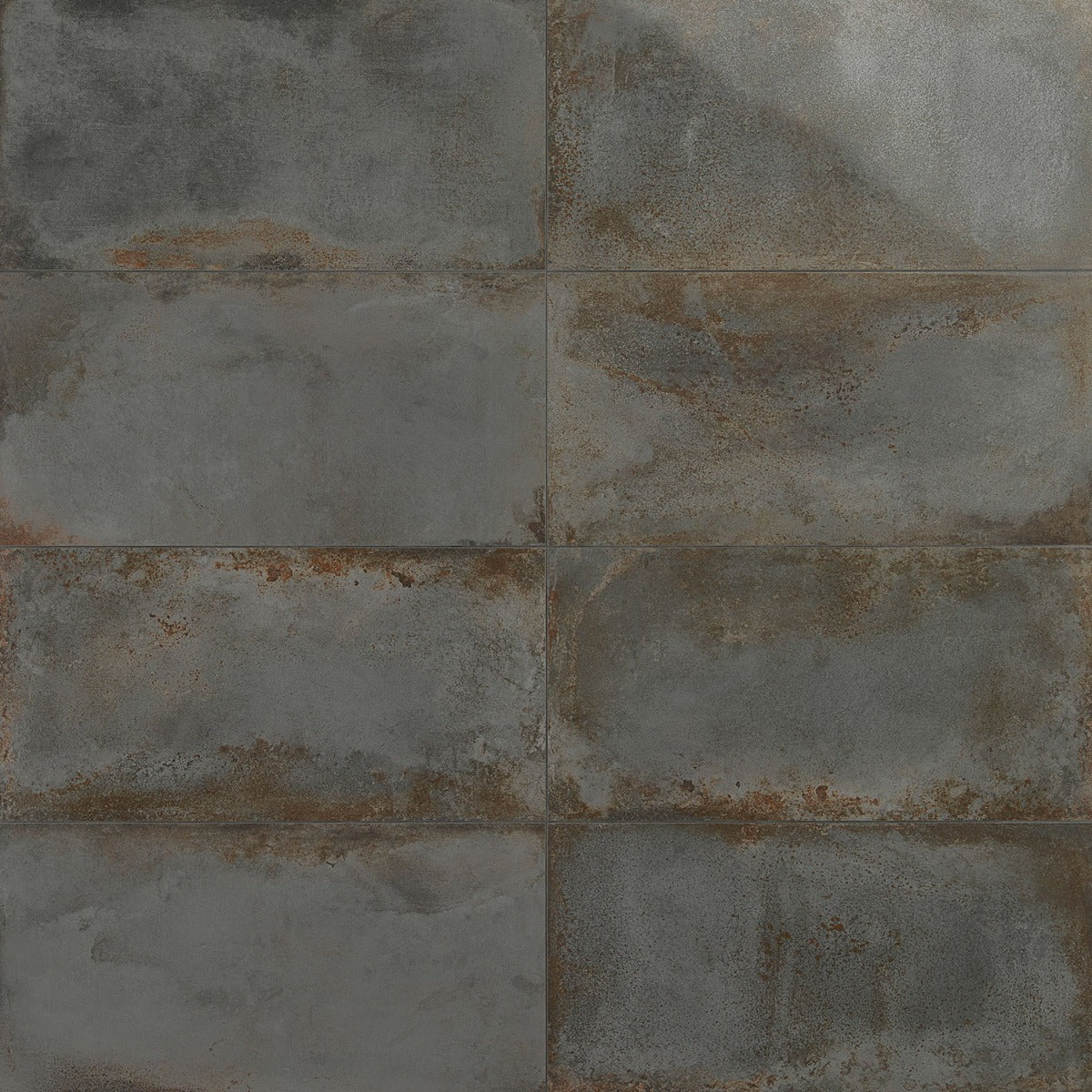 A: The tile features a semi-polished finish with a metallic patina effect.