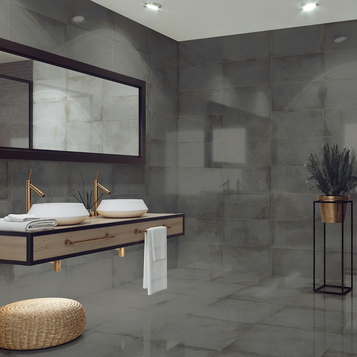 The Flatiron Graphite Gray 12x24 Semi-Polished Porcelain Tile by Angela Harris combines industrial inspiration with luxury. Featuring a metallic patina effect and a semi-polished finish, this tile is perfect for both residential and commercial spaces.