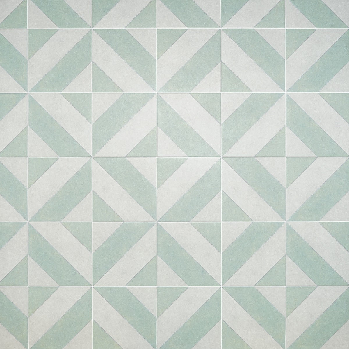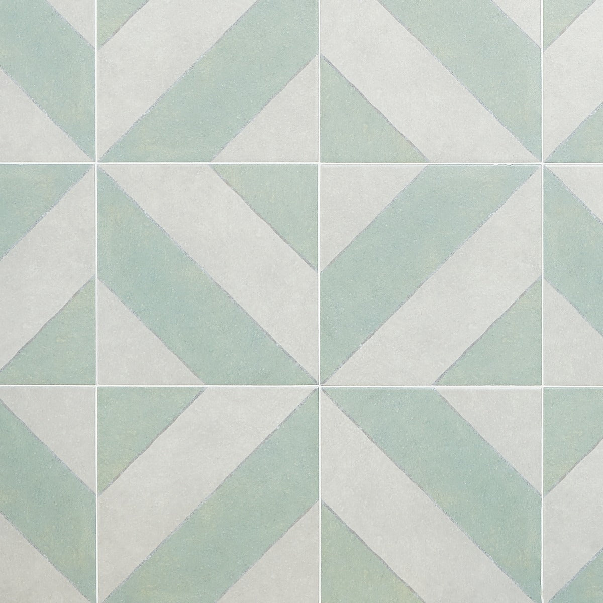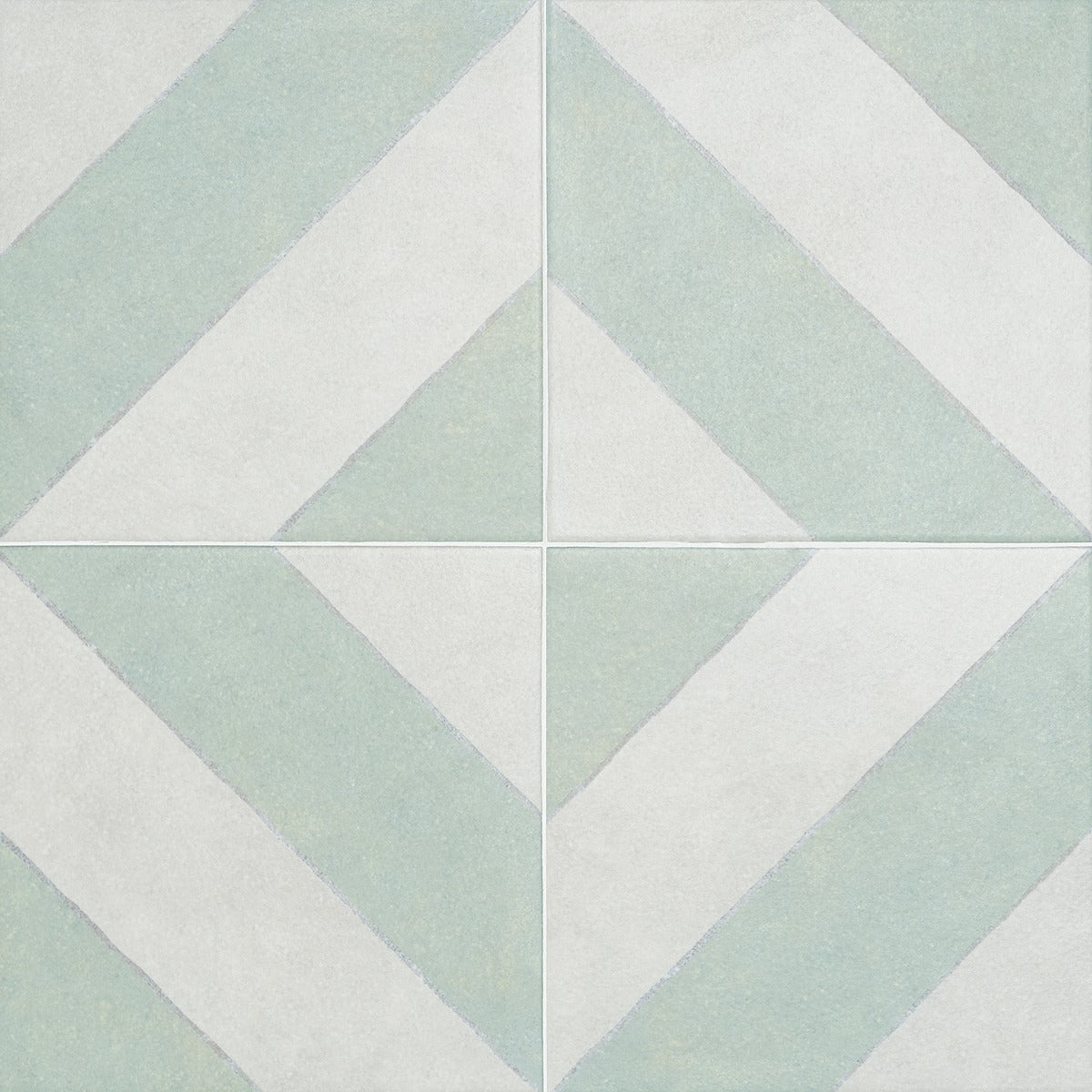 The Auteur Kaleidoscope Sage Green 9x9 Matte Porcelain Tile features a playful diagonal pattern in mossy green and white, offering artisanal quality and creative freedom. Its durable porcelain material replicates the look of handmade encaustic tiles, providing scratch, water, and fade resistance.
